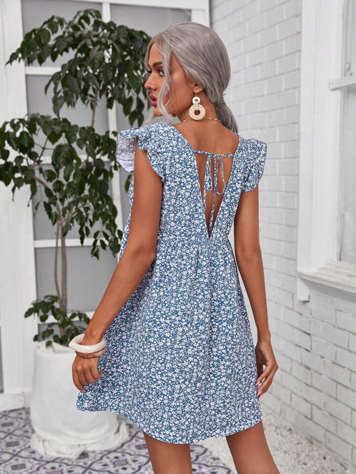 Ruffle Armhole Ditsy Floral Dress Summer Vacation Flower Blue Beach