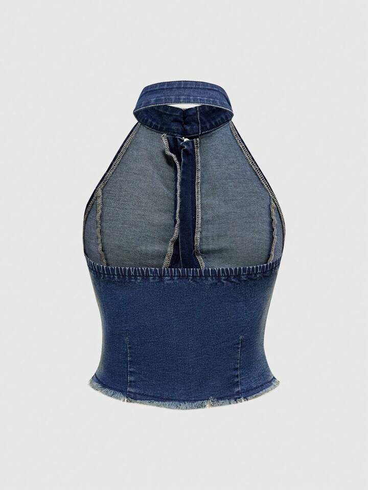 SHEIN x PRISCILA & JIMENA Grunge Punk Women Sleeveless Denim Front Zip Casual Blouse, Suitable For Holiday