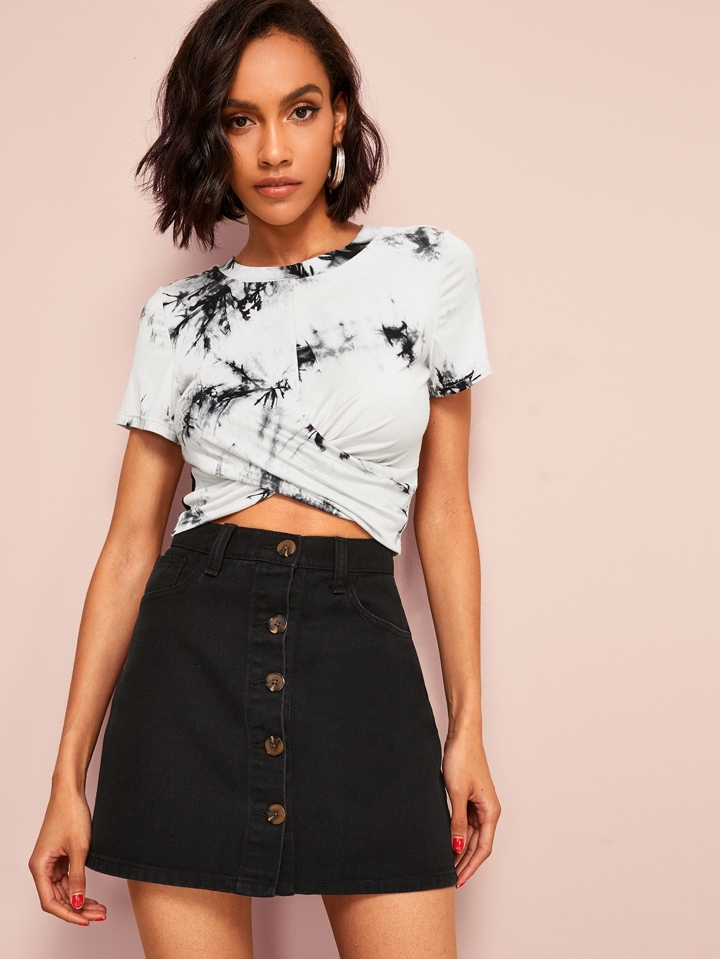 Single Breasted Slant Pocket Denim Skirt Black Summer Casual
