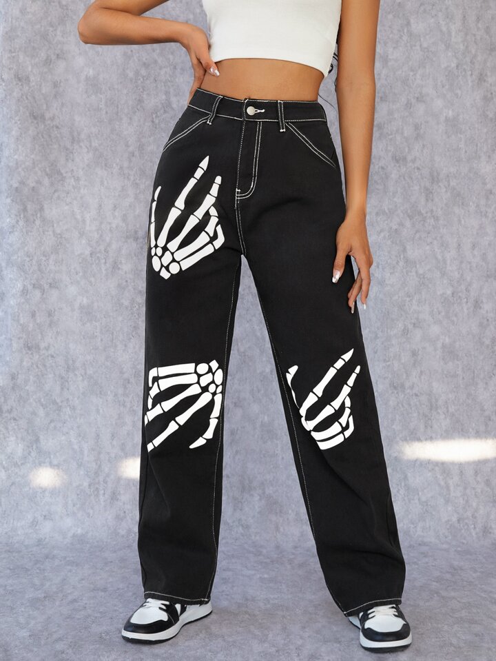 Skeleton Hand Print Contrast Stitch Wide Leg Jeans