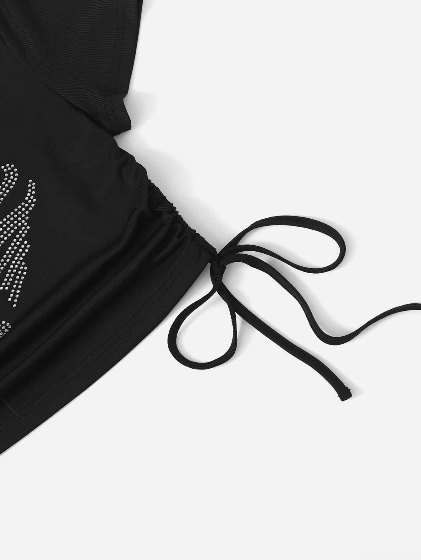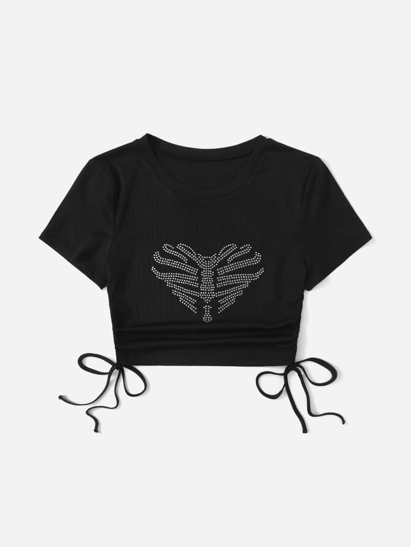 Skeleton Rhinestone Ribbed Ruched Crop Tee