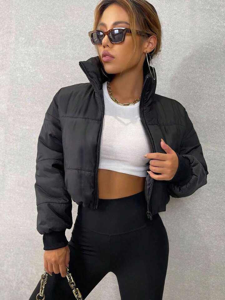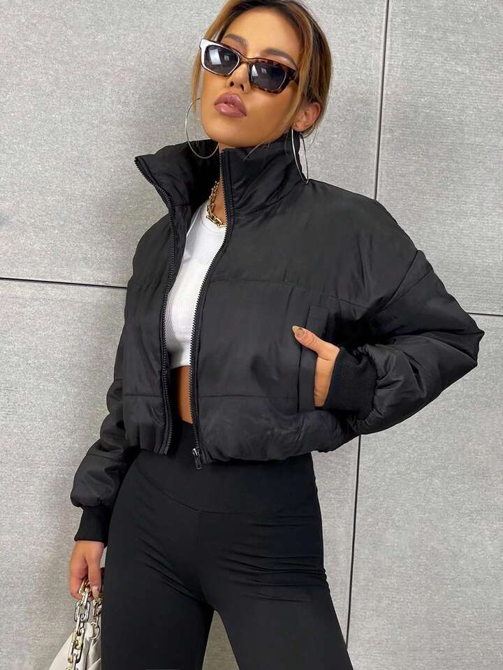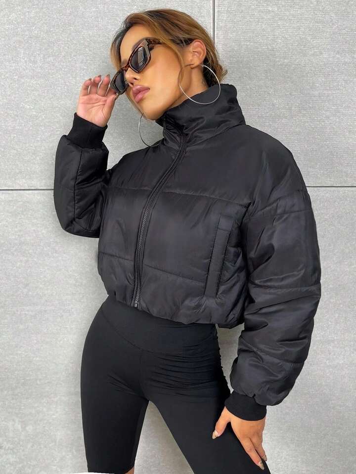 Slant Pocket Zipper Drop Shoulder Crop Padded Padded Coat Clothes Winter