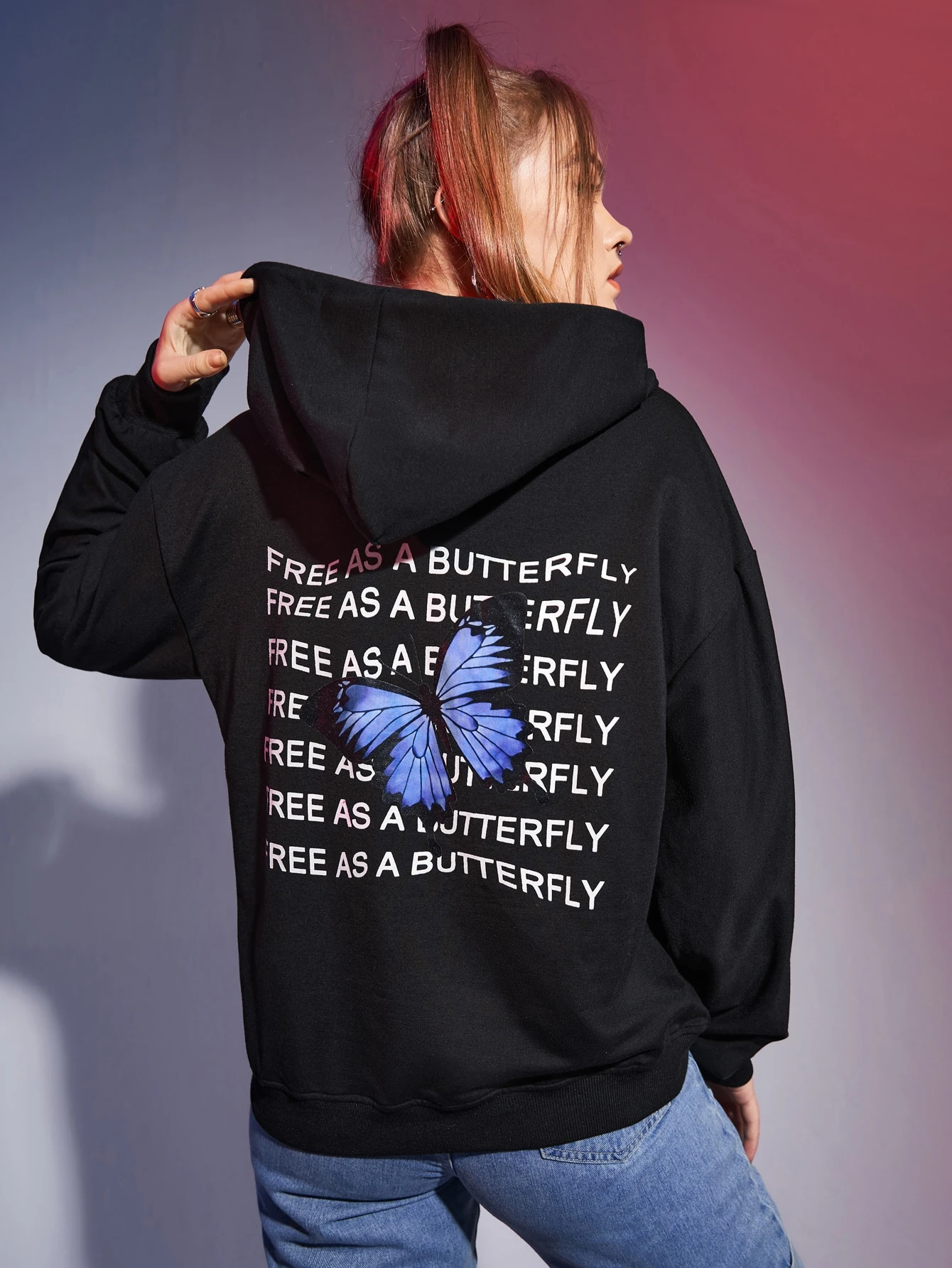 Slogan Butterfly Graphic Kangaroo Pocket Drawstring Hoodie