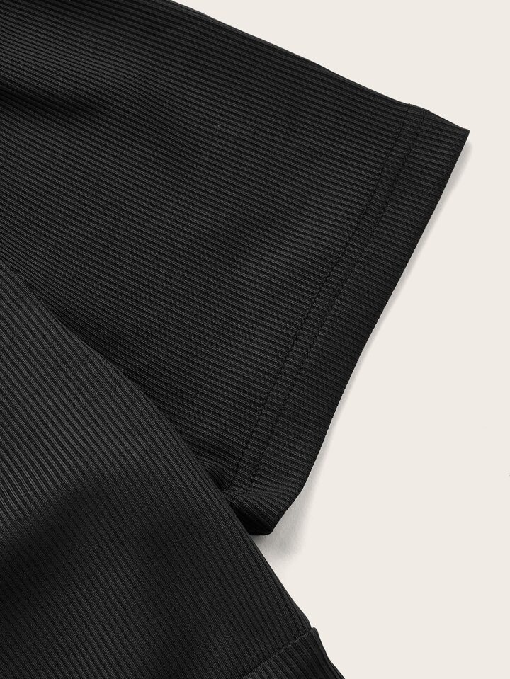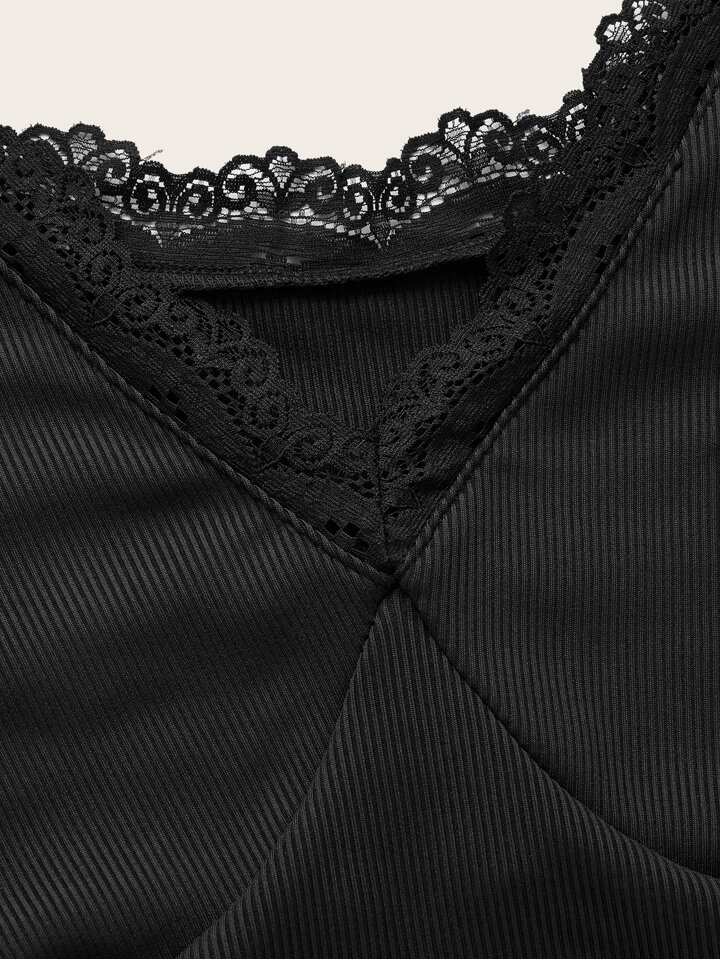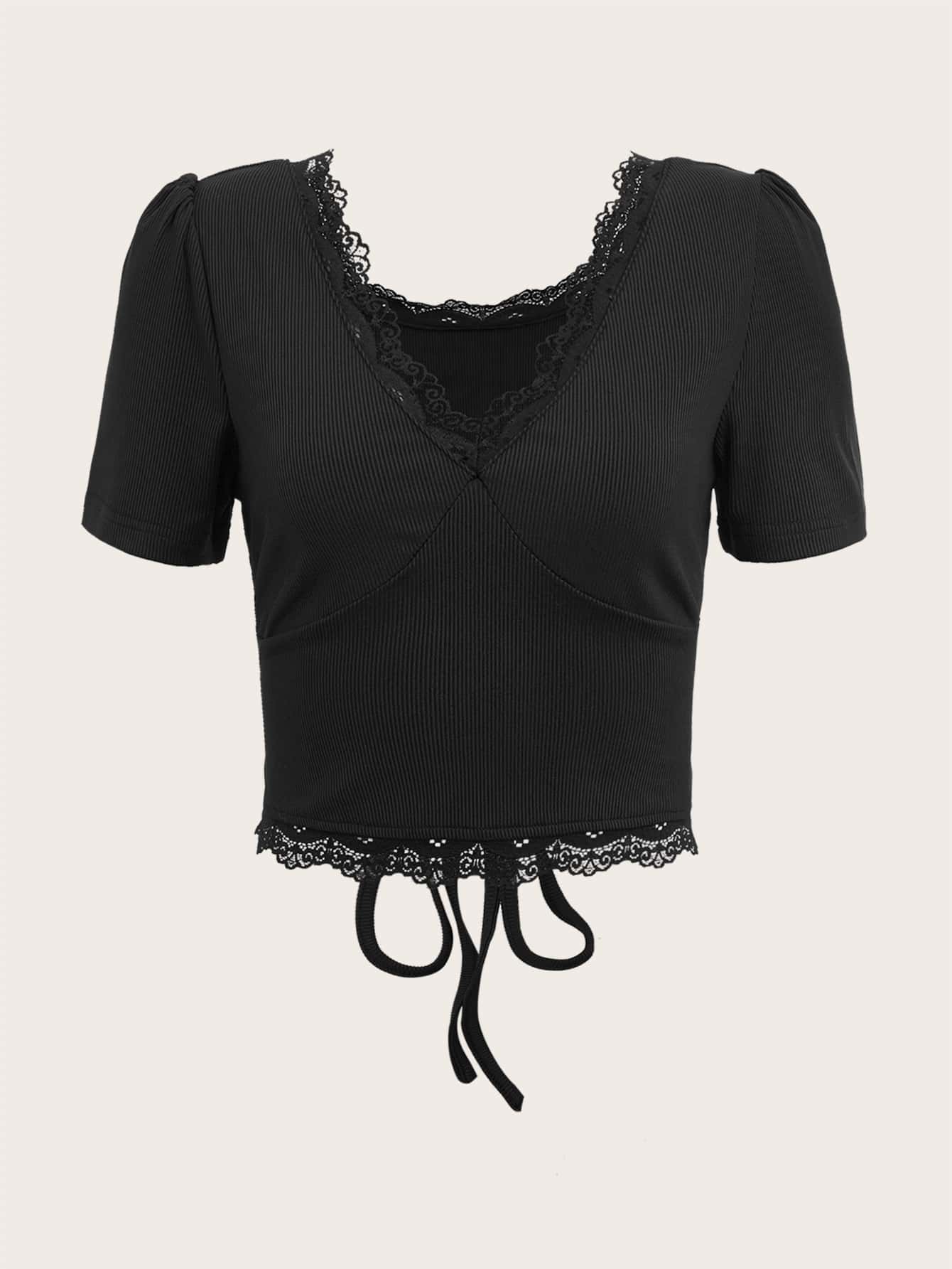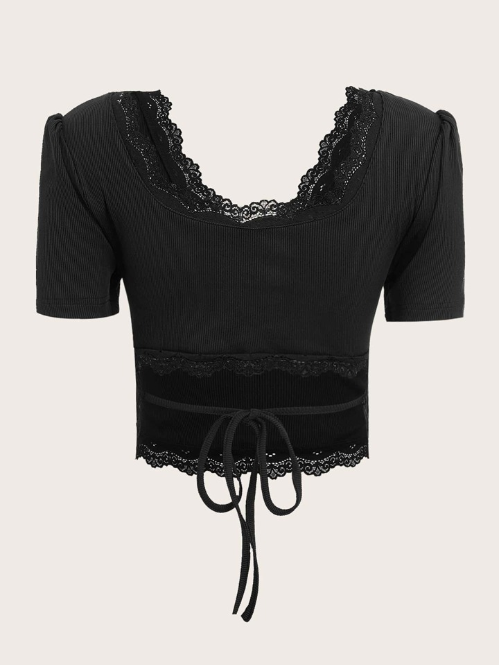Solid Contrast Lace Ribbed Tie Back Tee
