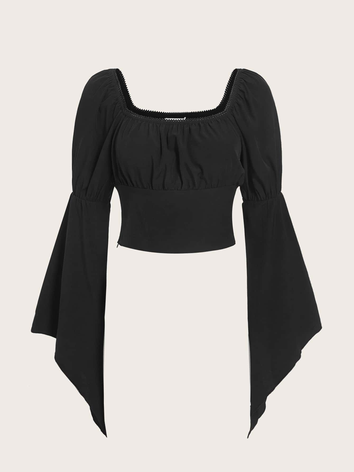 Solid Ruched Bust Flounce Sleeve Crop Blouse