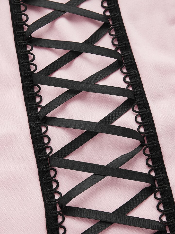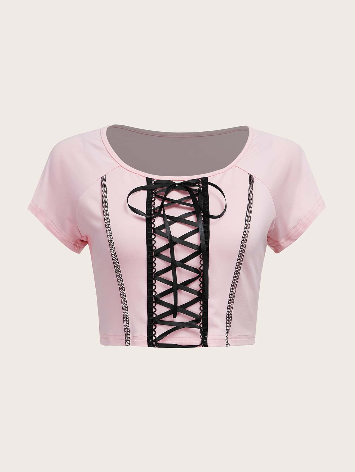 Solid Stitching Trim Lace Up Tie Front Crop Tee