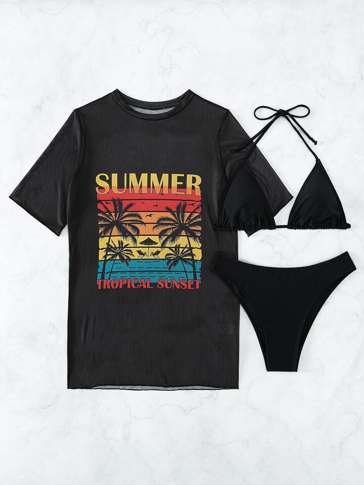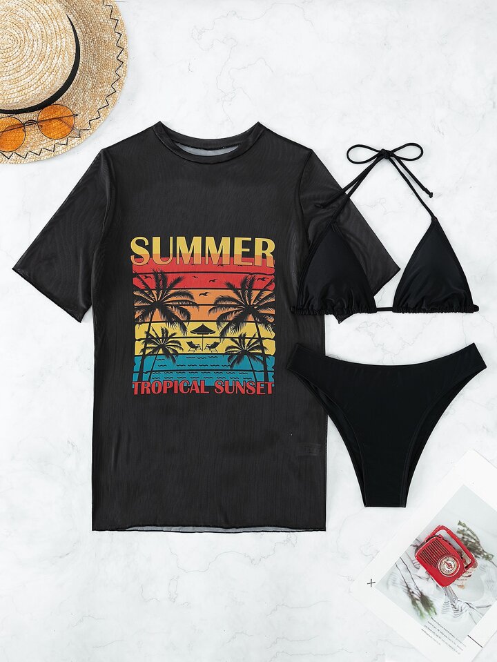 Solid Summer Beach Bikini Set With Letter & Tropical Print Cover Up