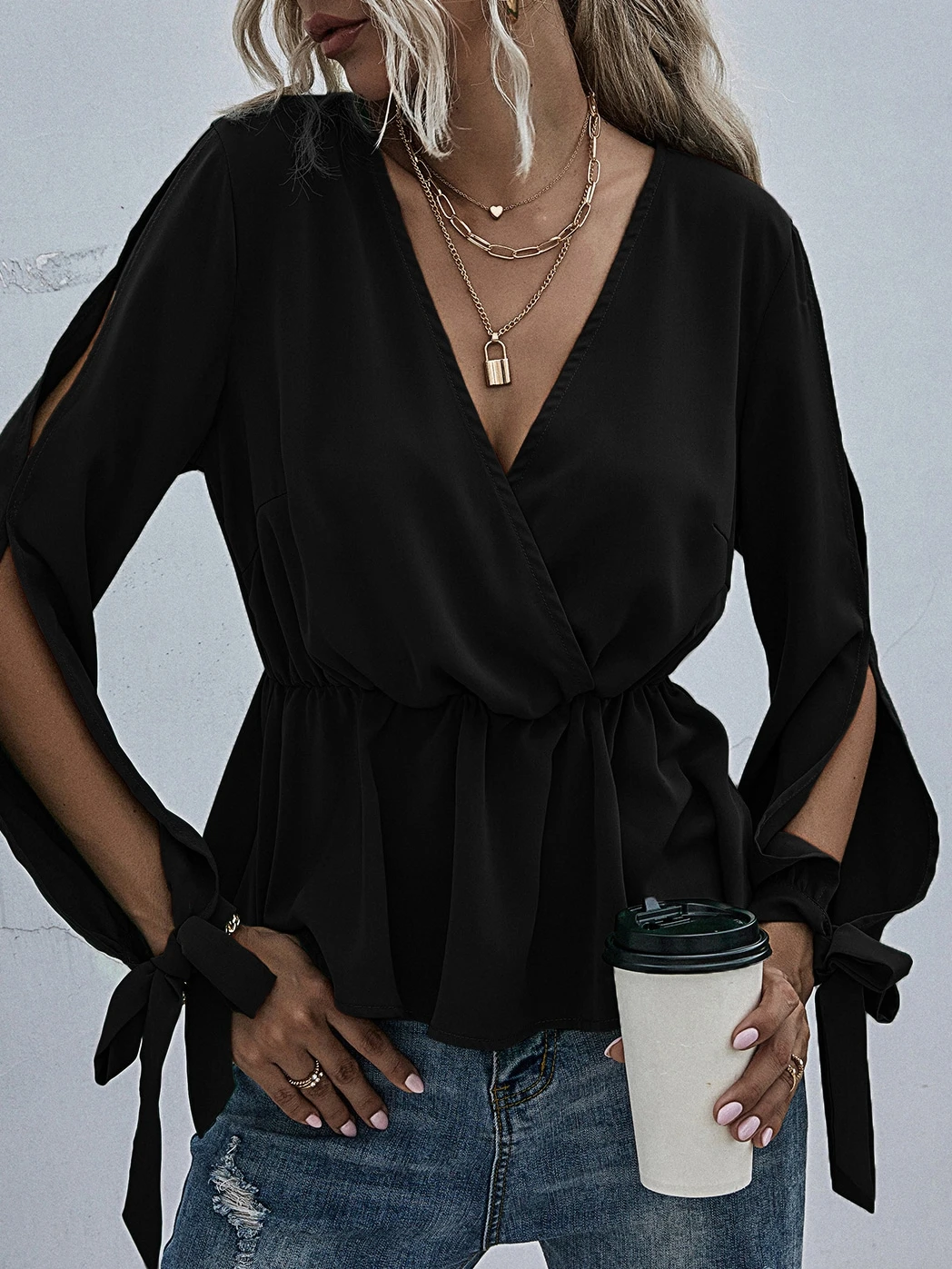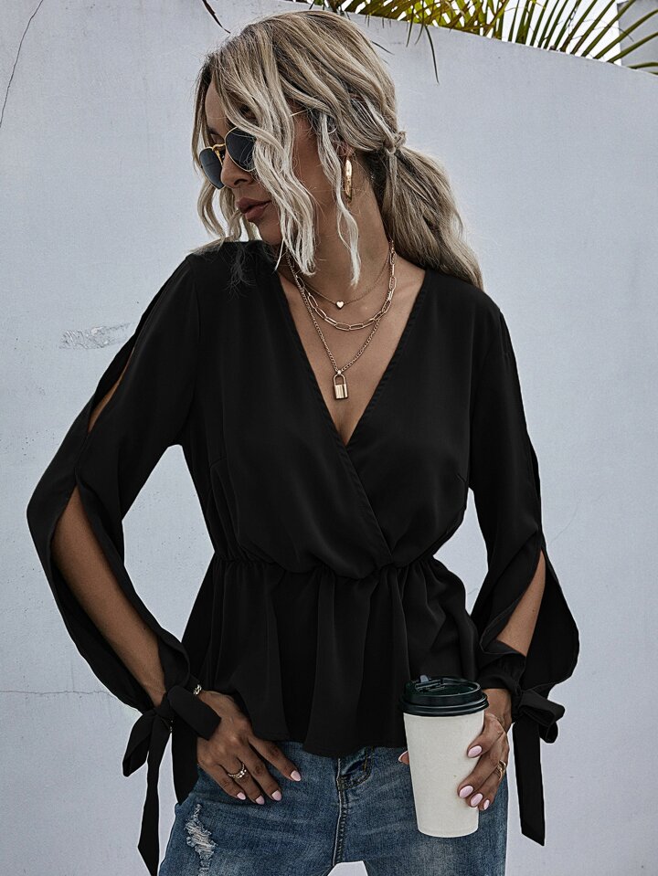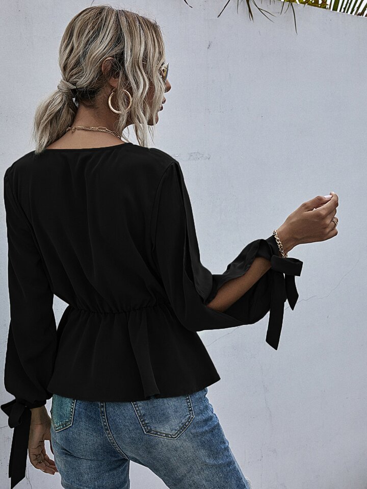 Split Sleeve Tie Cuff Peplum Blouse