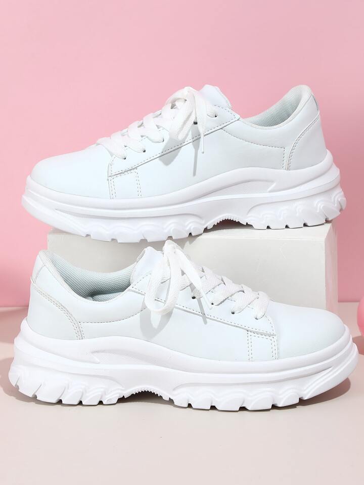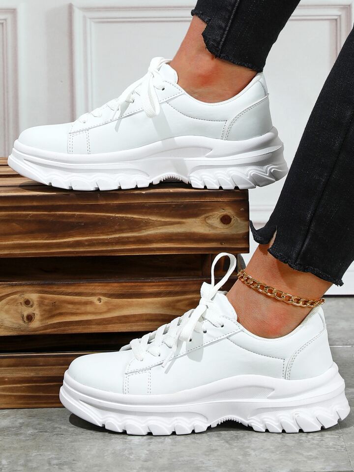 Sporty White Chunky Shoes For Women, Stitch Detail Lace Up Sneakers