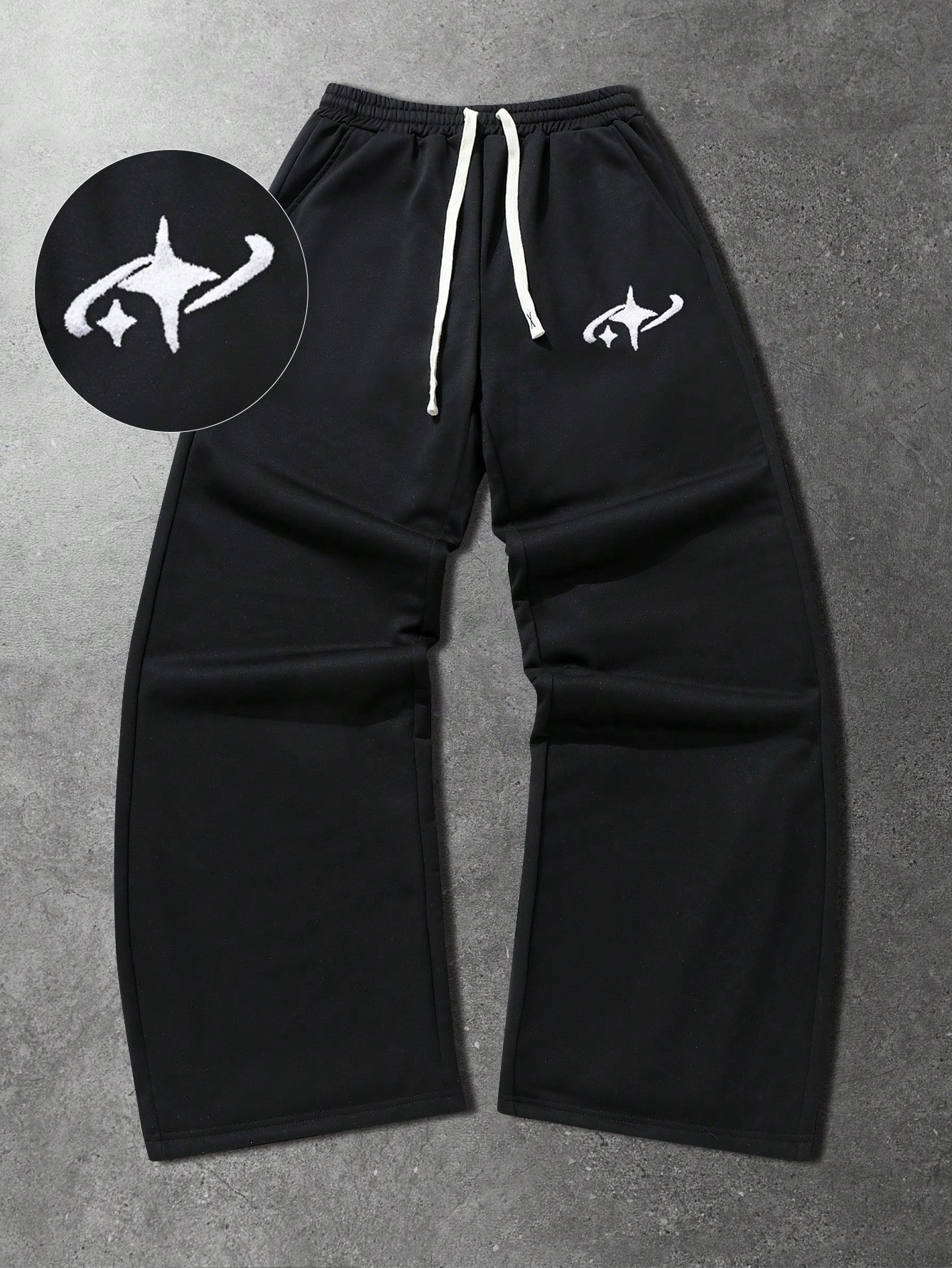 Spring Casual Graphic Brand Starry Pattern Sweatpants, Unisex Loose Drawstring Wide Leg Casual Pants, High Street Style Black Joggers