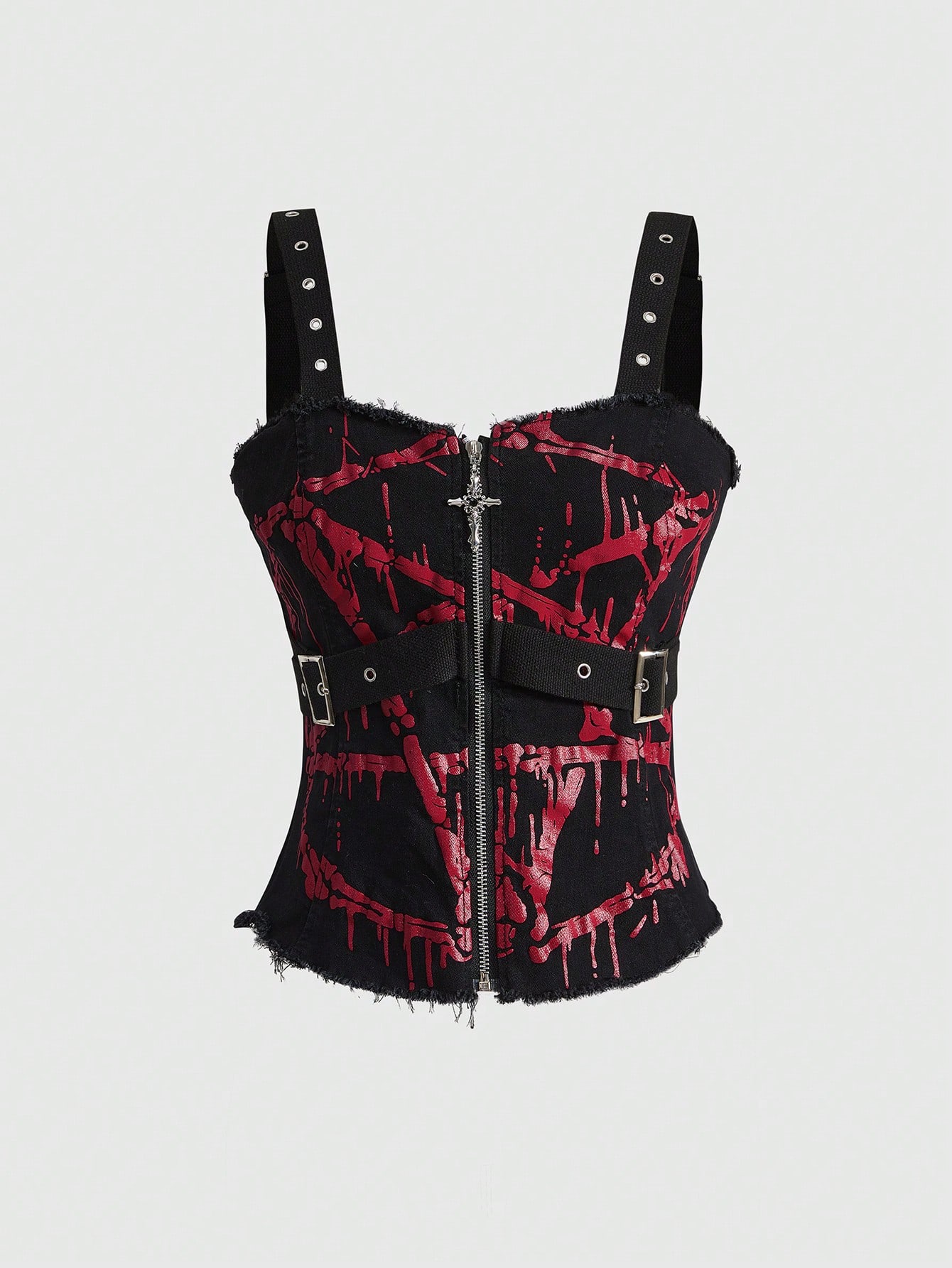 Spring/Summer Casual Red Gothic Pentagram Fluid Print Metal Rivet Eyelet Design Skinny Denim Vest