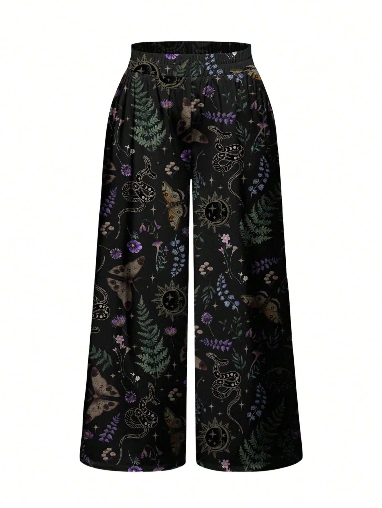 Spring/Summer Vacation Flower Black Gothic Dark Mysterious Witch Moth Leaf Plant Butterfly Snake Sun Moon Star Plus Size Loose Wide Leg Allover Print Pants