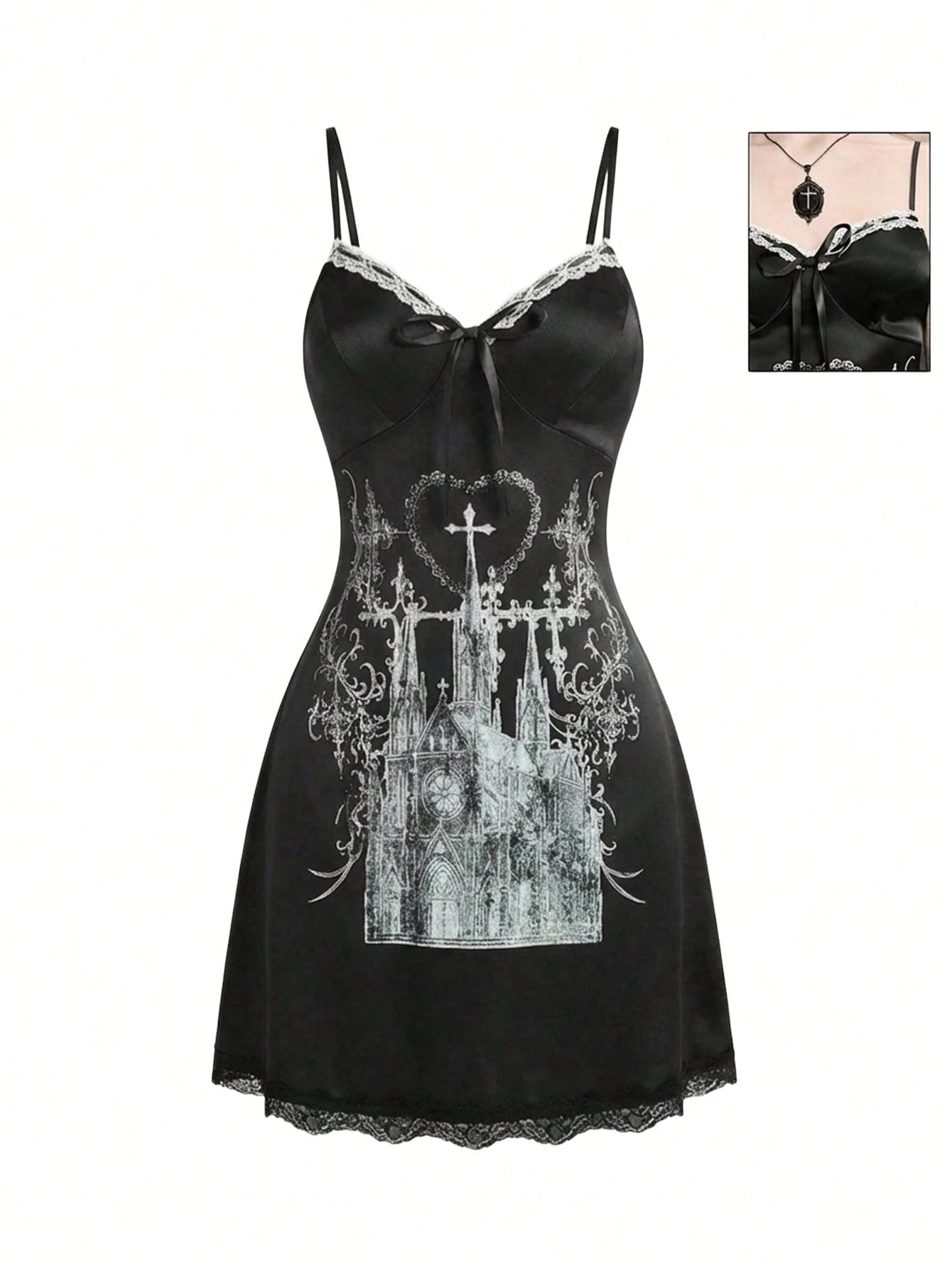 Spring/SummergraphicGothic Angel Cross Castle Church Cross Thorn Cyber Rune Heart Lace Satin Women Mini Dress, Spring/Summer, For Valentine's Day