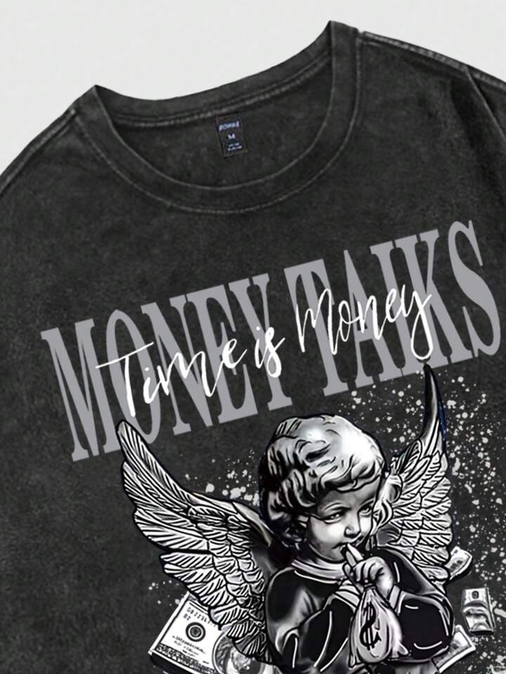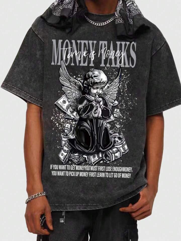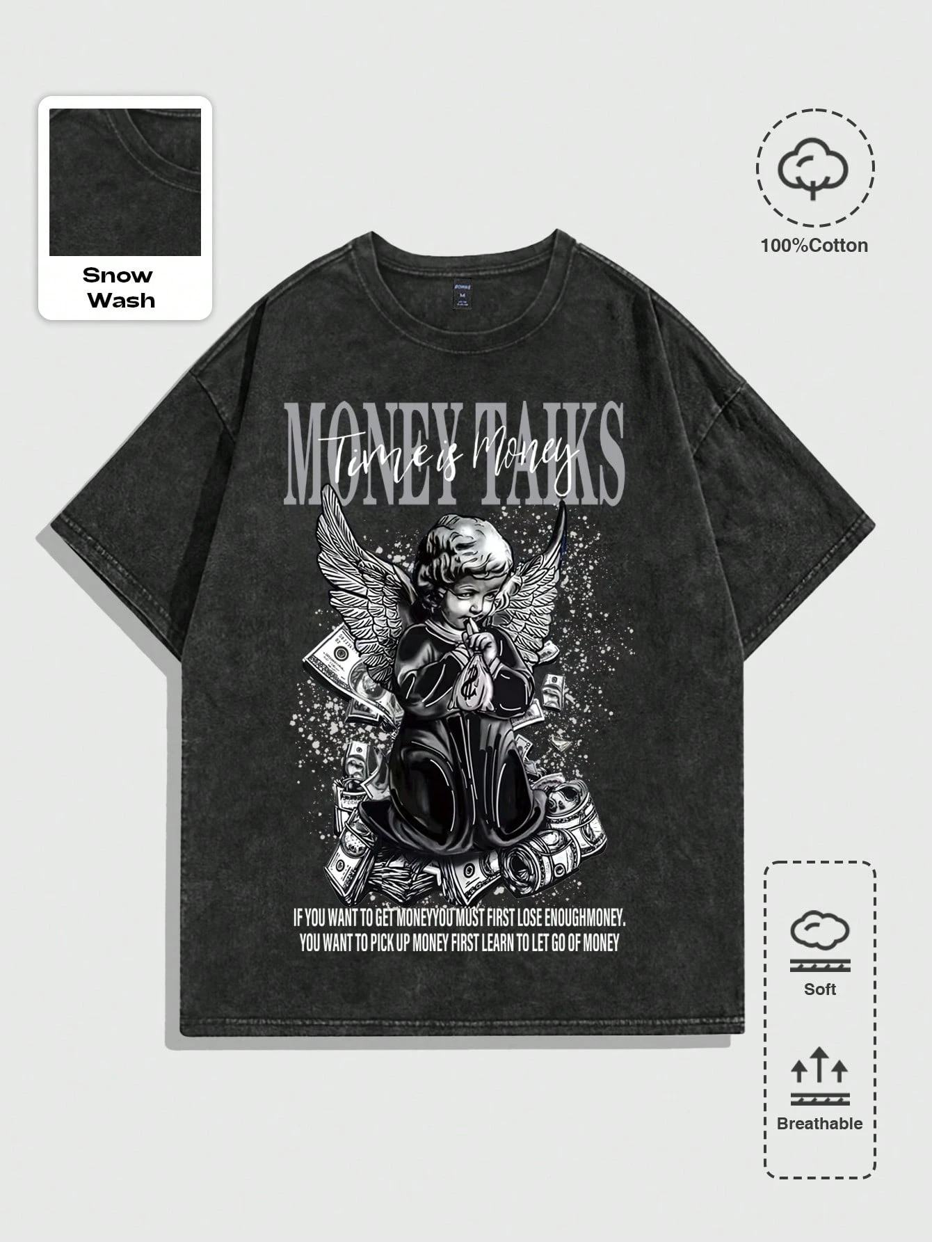 Street Life 2025 Summer New Street Angel Men's Fluffy Acid-Washed Cotton Round Neck Short Sleeve T-Shirt,