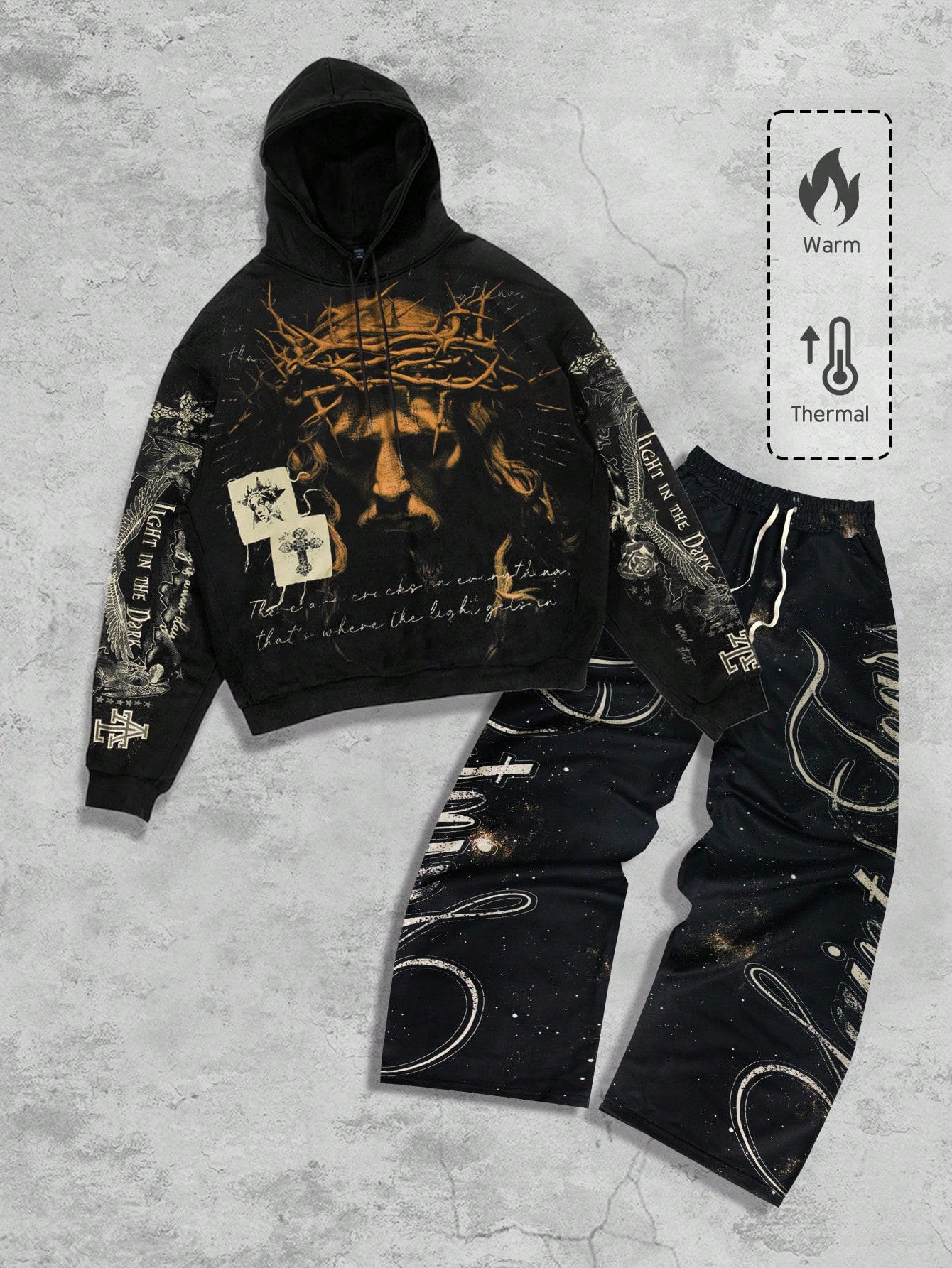 Street Life 2pcs Men's Jesus Hooded Sweatshirt And Pants Set, Autumn/Winter