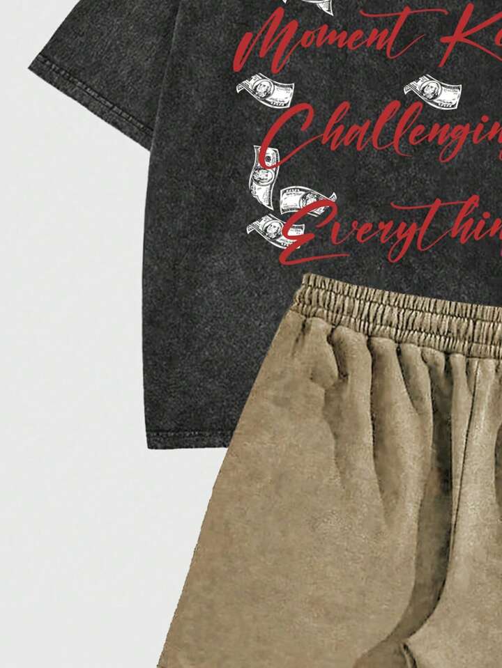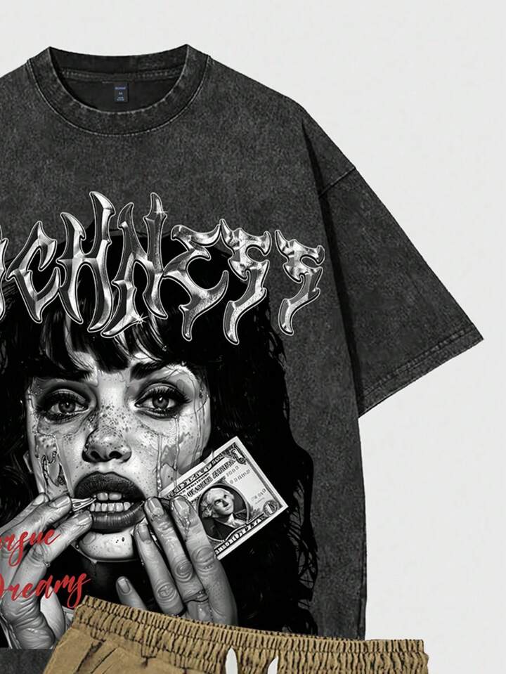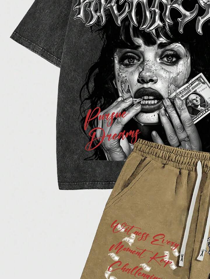 Street Life 2pcs Men's Portrait Graphic Vintage Washed Short Sleeve T-Shirt Set, Summer
