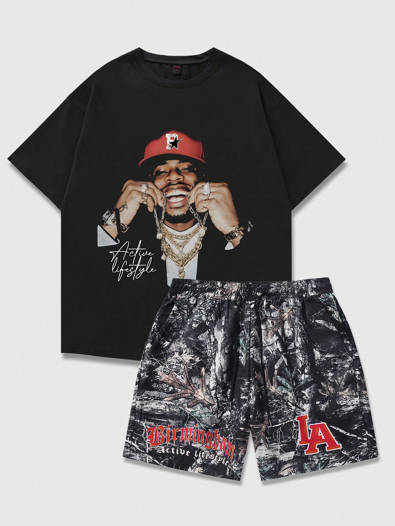 Street Life 2pcs Plus Size Women Street Style American Portrait Chain & Branch Graphic Print Shorts Set