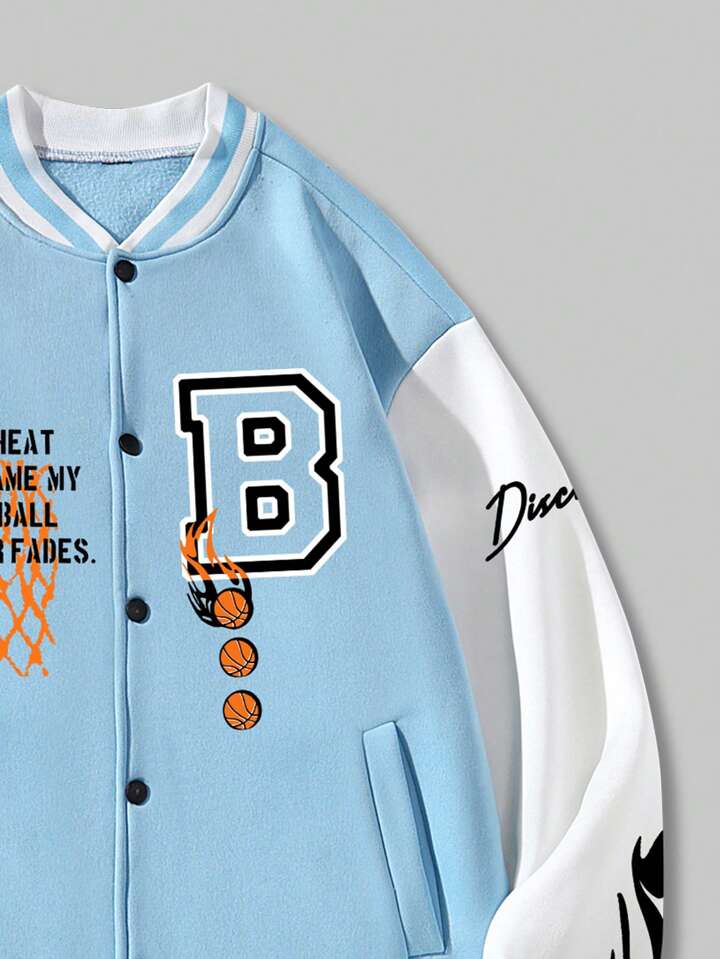 Street Life Guys Basketball & Slogan Graphic Two Tone Varsity Jacket