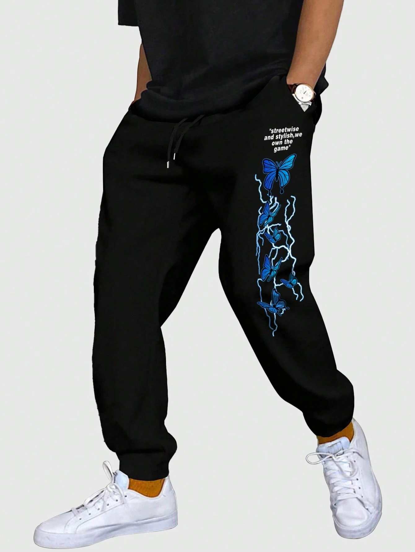 Street Life Guys Slogan & Butterfly Print Drawstring Waist Sweatpants