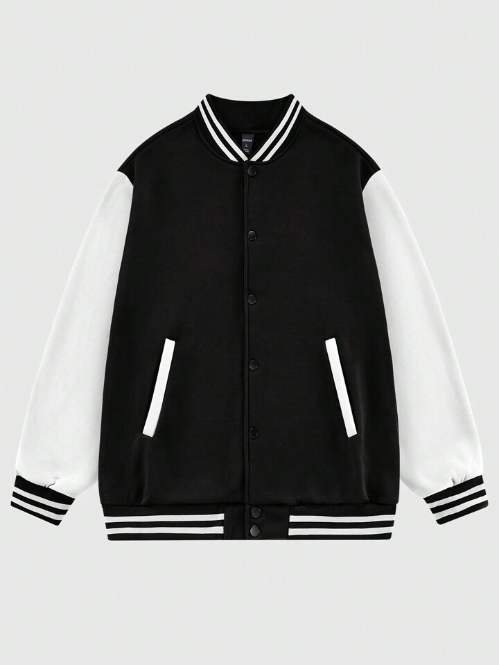 Street Life Guys Slogan & Figure Print Striped Trim Varsity Jacket