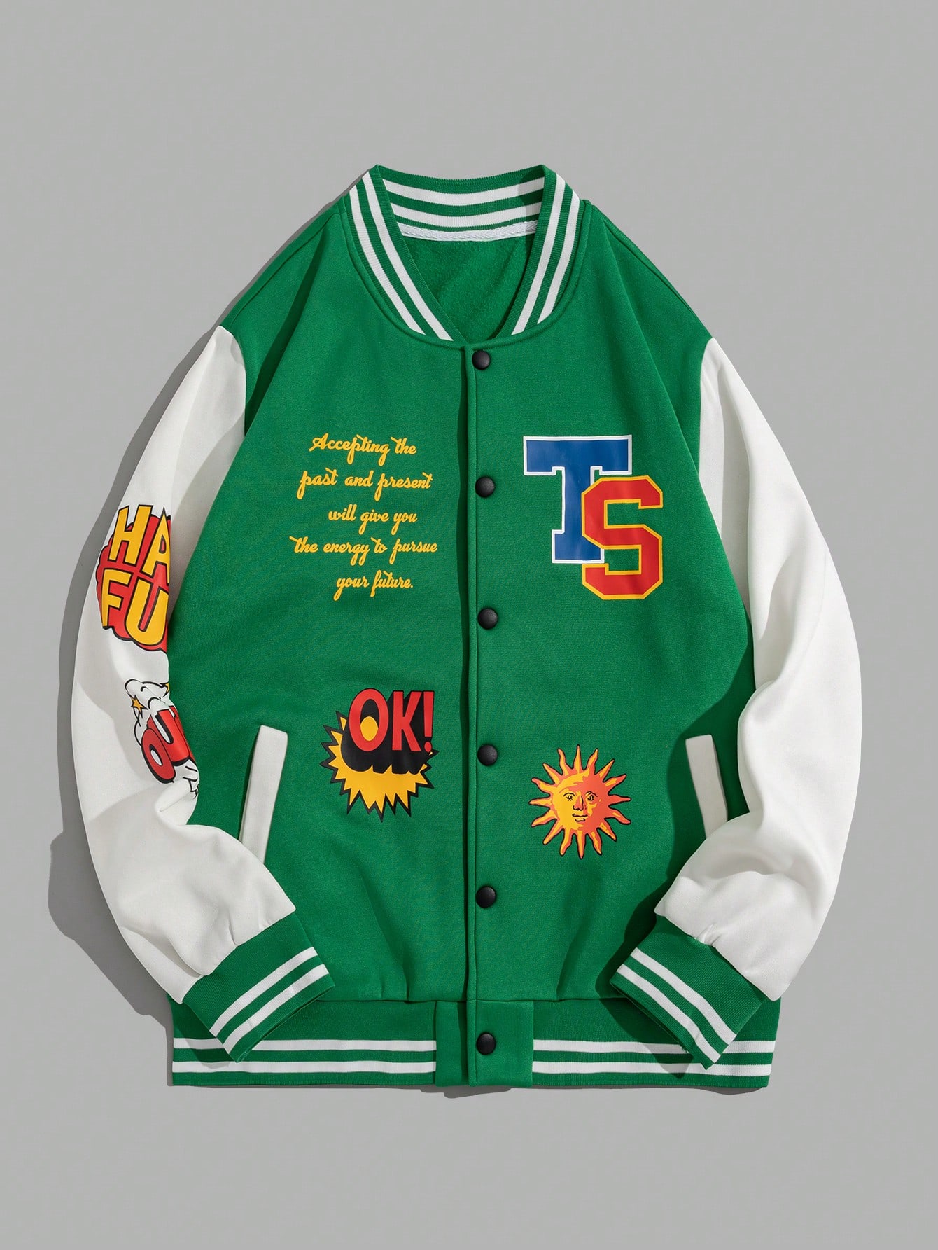 Street Life Guys Slogan Graphic Striped Trim Colorblock Varsity Jacket