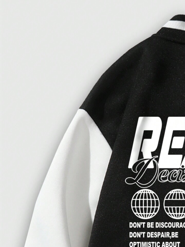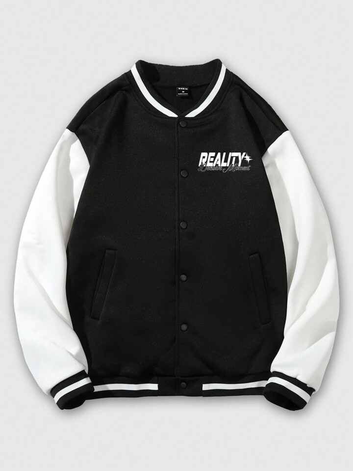 Street Life Guys Slogan Graphic Striped Trim Drop Shoulder Varsity Jacket