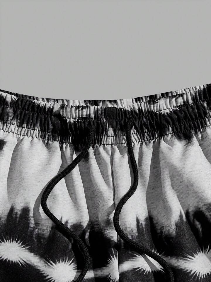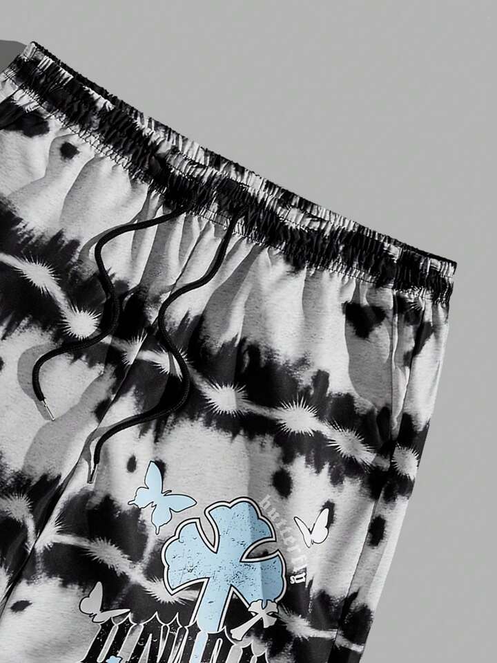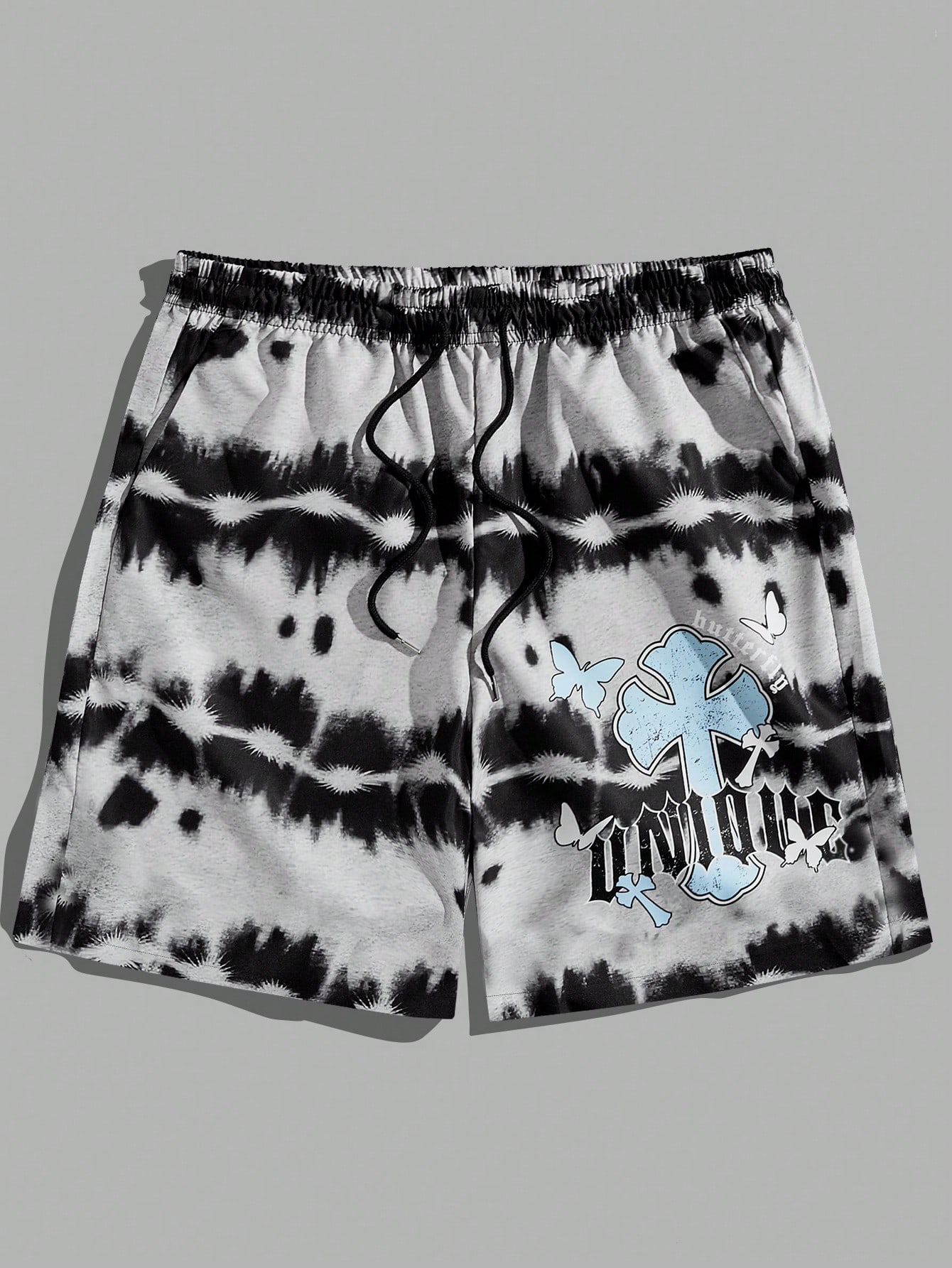 Street Life Guys Tie Dye Letter & Cross Print Striped Trim Drawstring Shorts