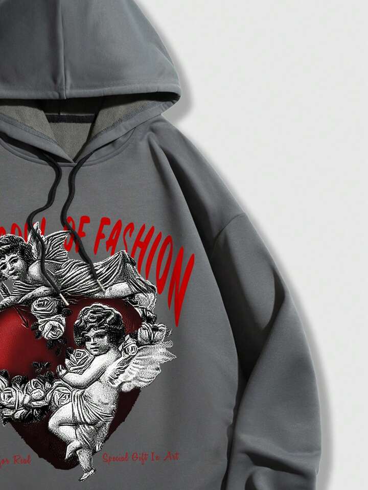 Street Life Men Angel Pattern Drawstring Hoodie 1/4 Zip For Everyday Wear