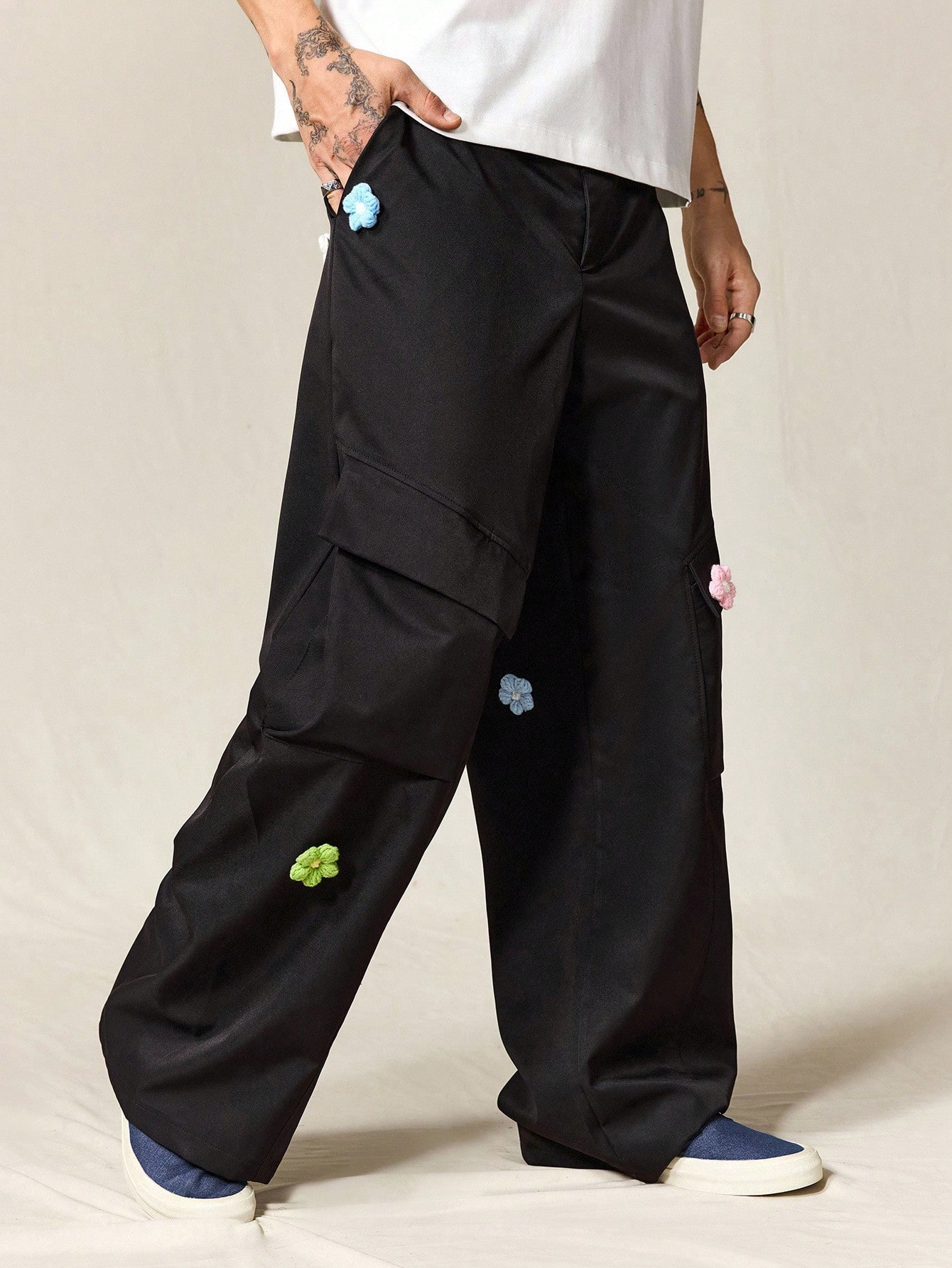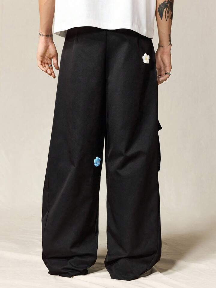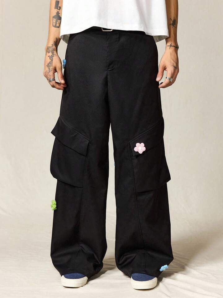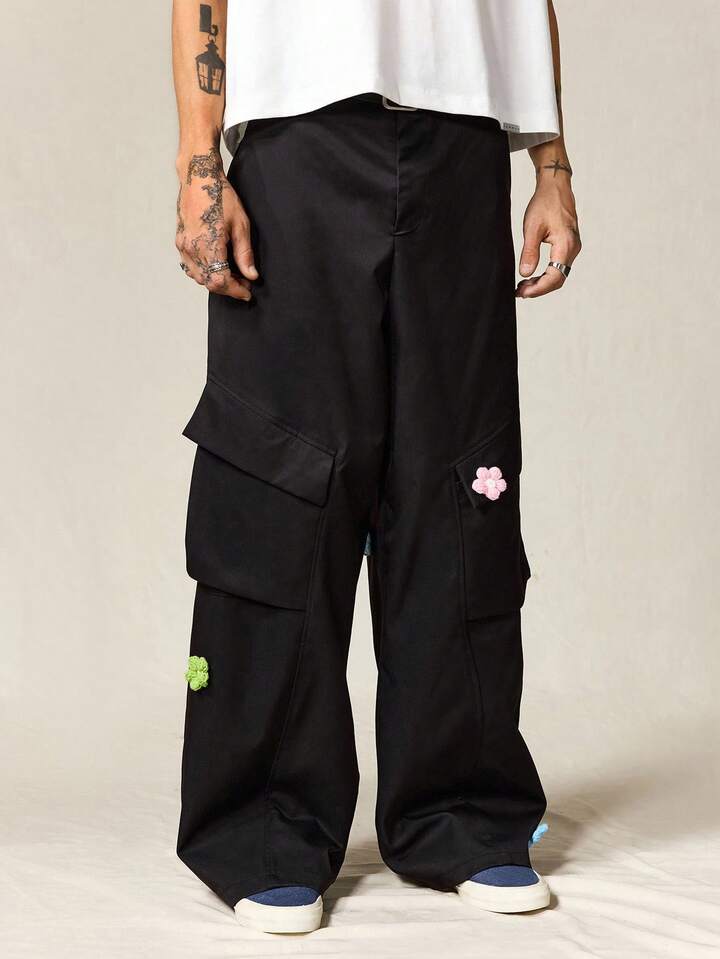 Street Life Men Casual Loose Fit Floral Cargo Pants With Patch Pockets, College Style, Fall