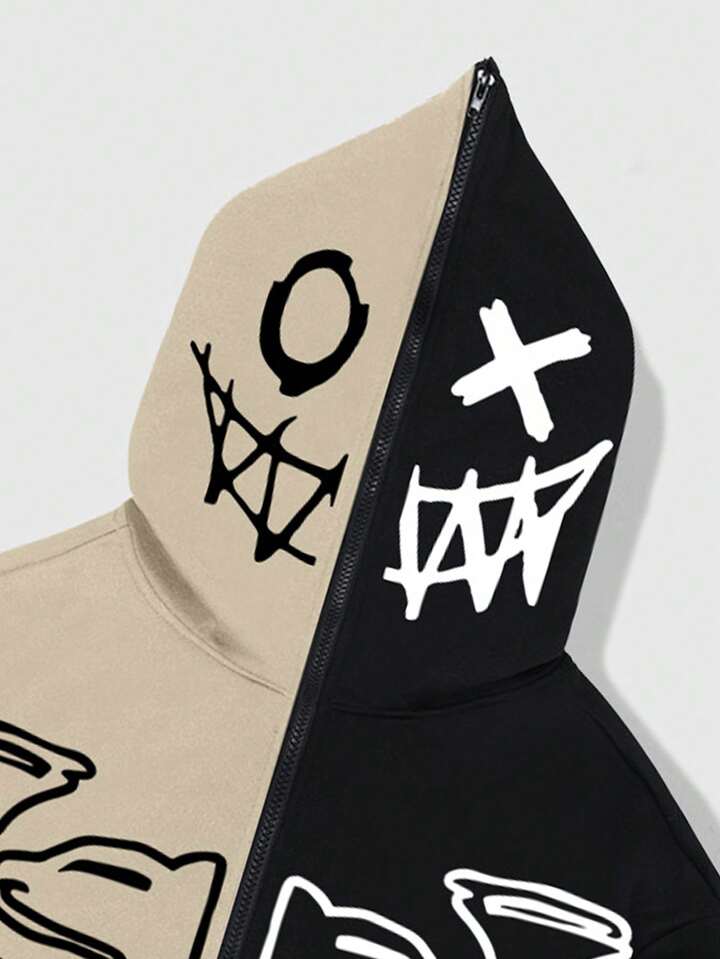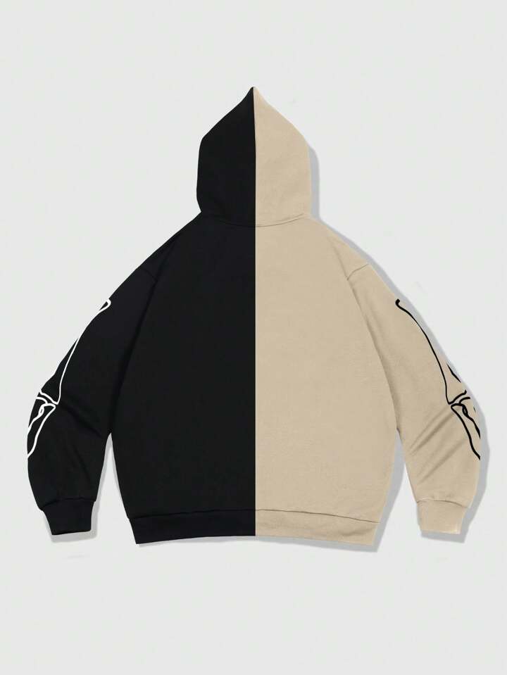 Street Life Men Casual Street Cartoon & Skeleton Print Two Tone Zip Up Hoodie Sweatshirt, Warm Thermal Lined For Autumn/Winter