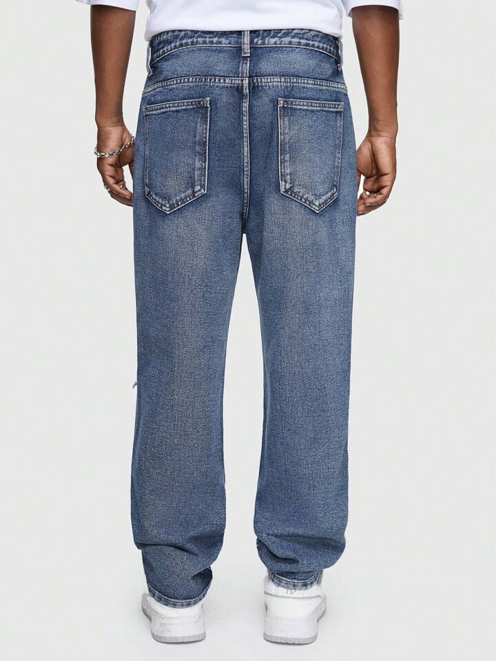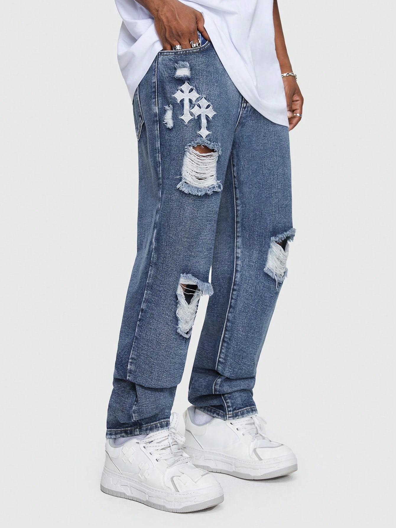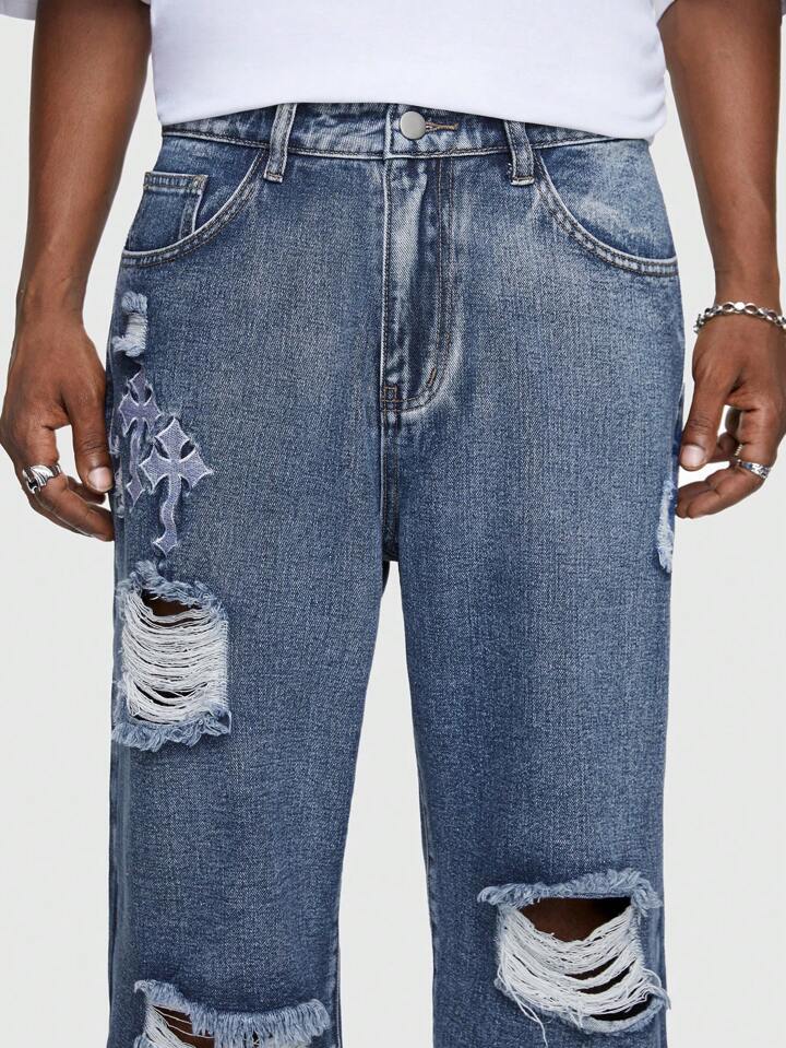 Street Life Men Cross Embroidered Ripped Straight Leg Jeans