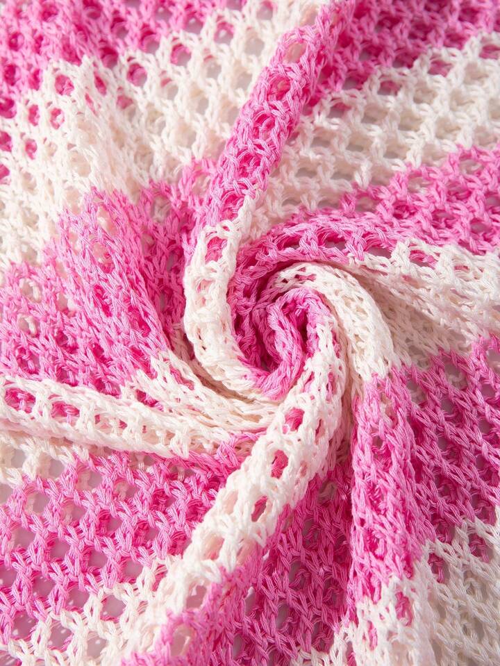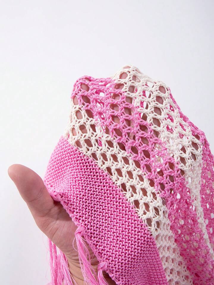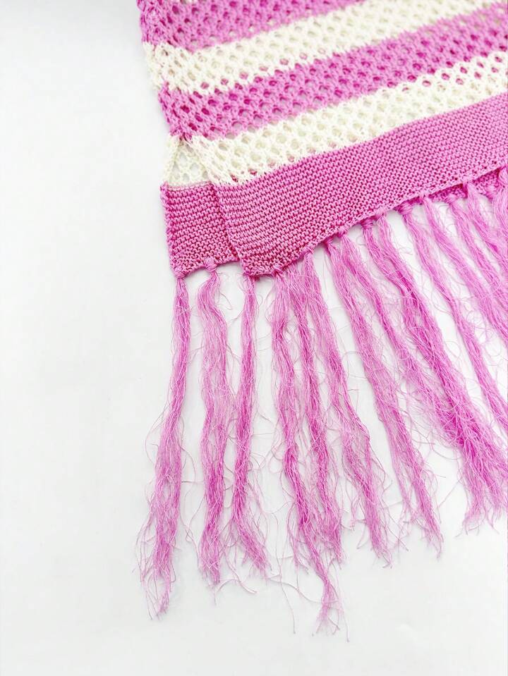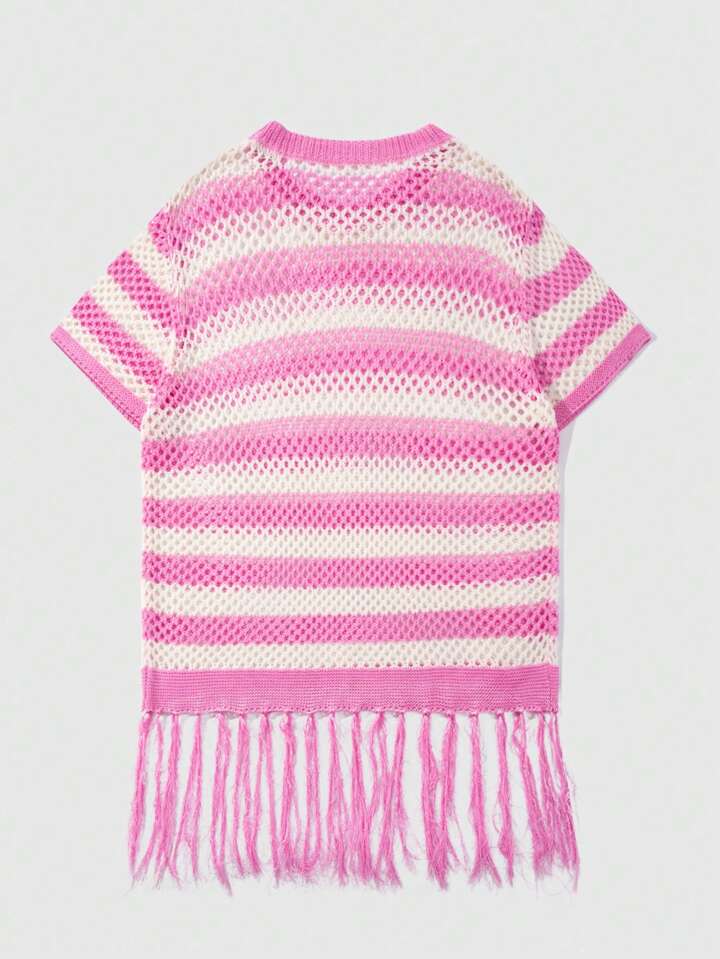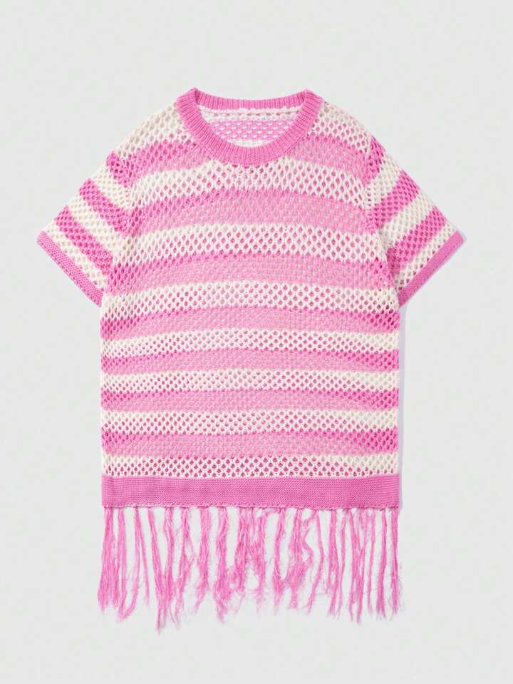 Street Life Men Hollow Striped Tasseled Knit Short Sleeve Round Neck Top, Summer Vacation