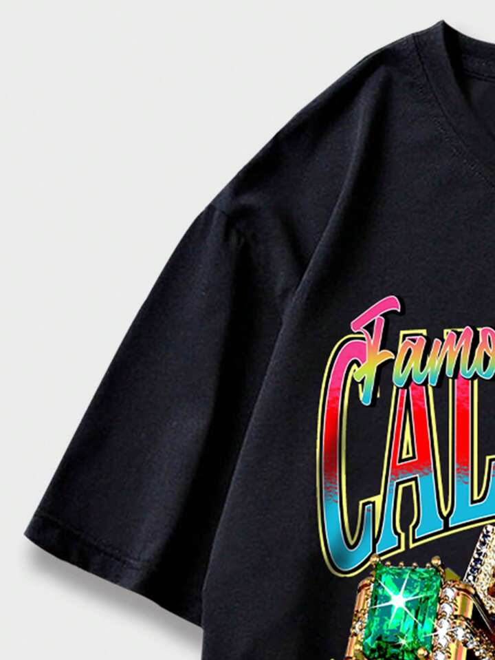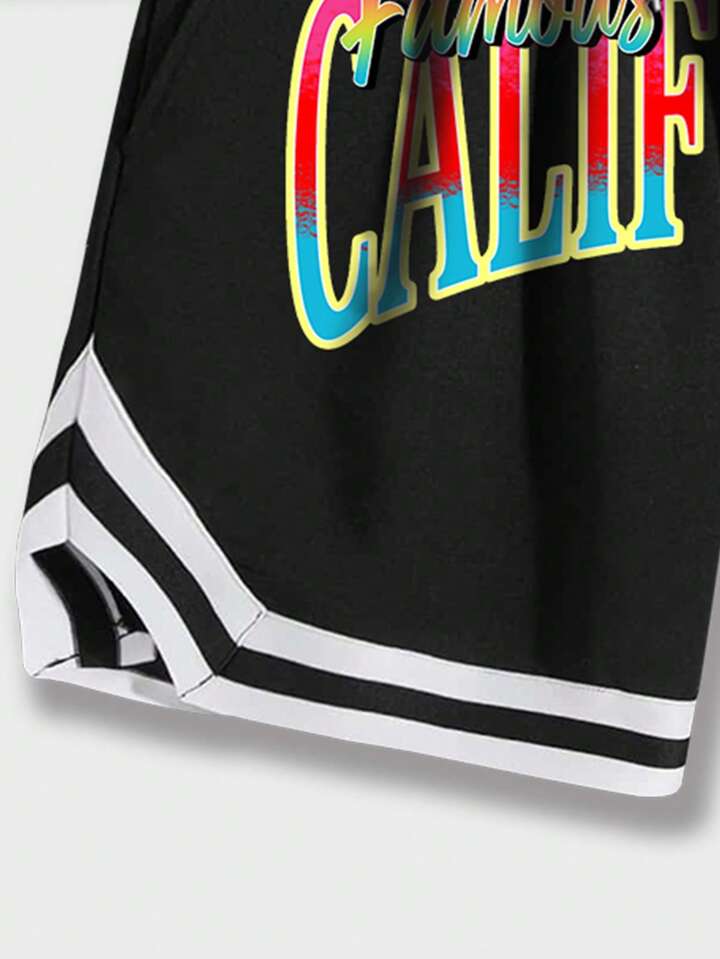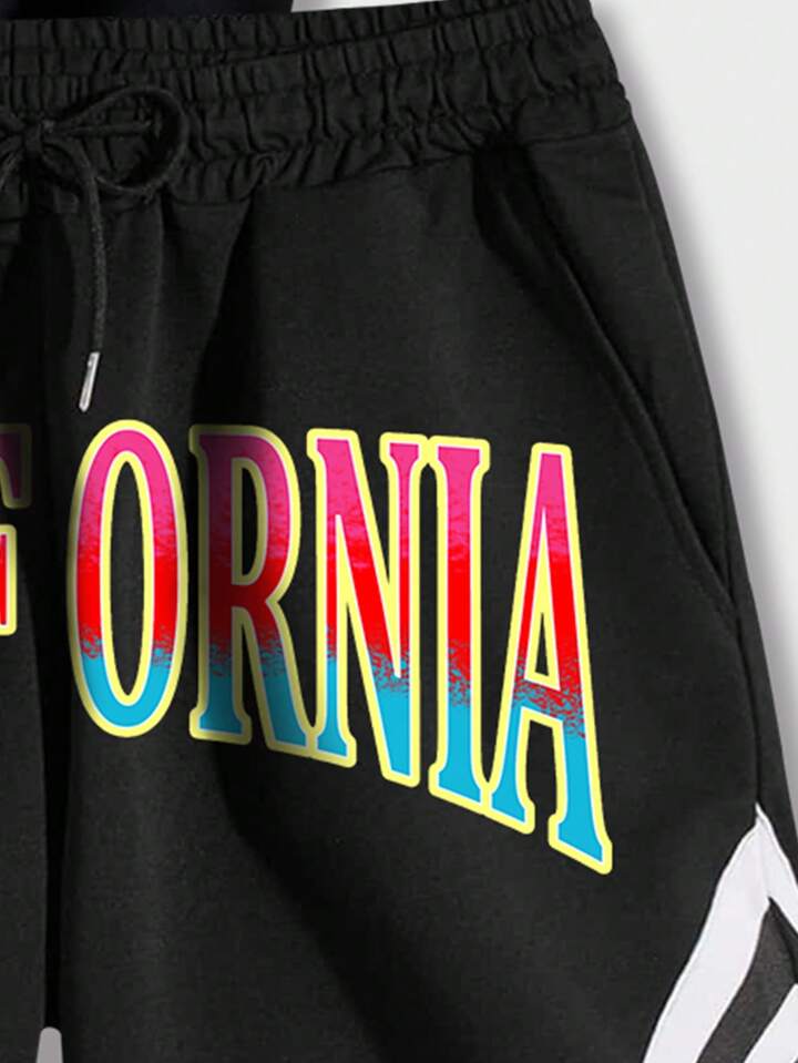 Street Life Men Letter Graphic Tee & Striped Trim Drawstring Waist Shorts