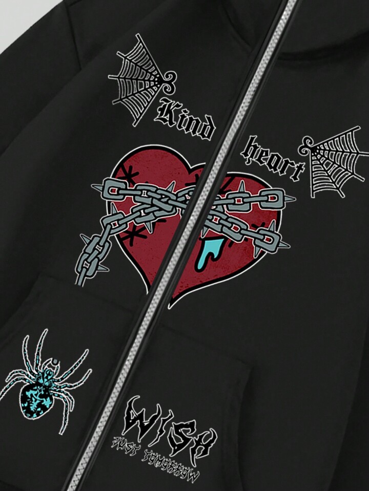 Street Life Men Letter & Heart Print Zip Up Hoodie
