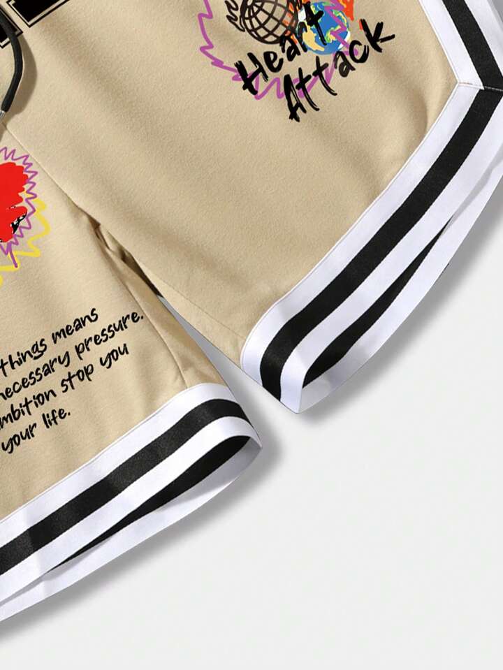 Street Life Men Skeleton & Slogan Graphic Striped Trim Drawstring Waist Shorts, School