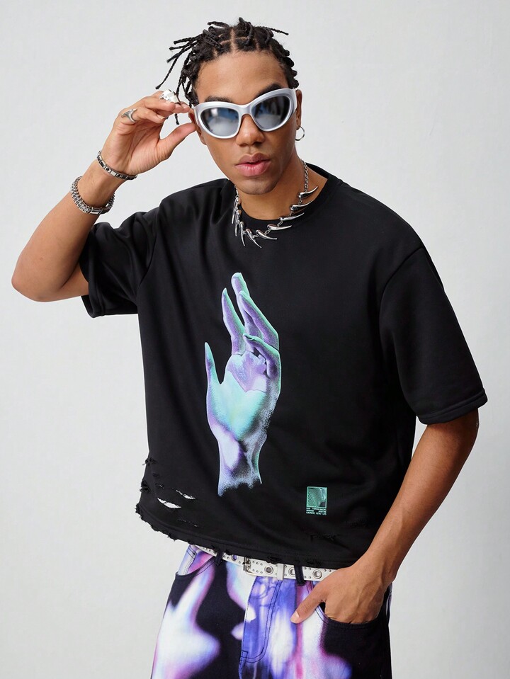 Street Life Men's 3D Printed Ripped Loose Cropped T-Shirt