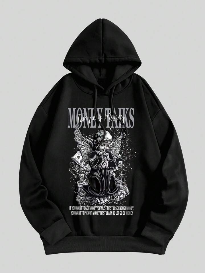 Street Life Men's Angel & Slogan Printed Hooded Sweatshirt & Sweatpants Set With Drawstring, School