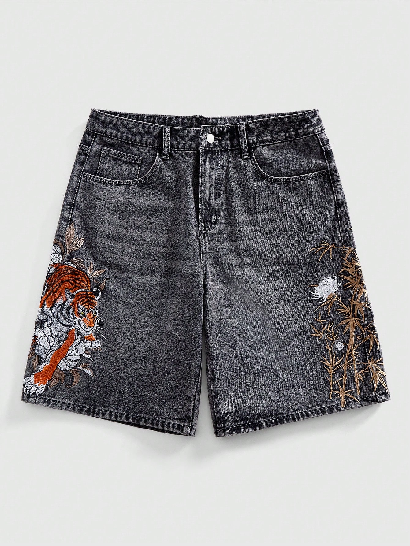 Street Life Men's Animal & Plant Embroidery Slant Pocket Casual Denim Shorts