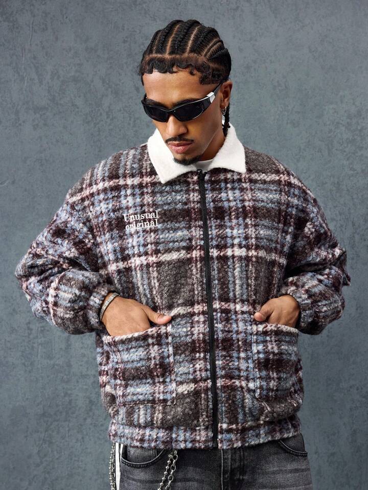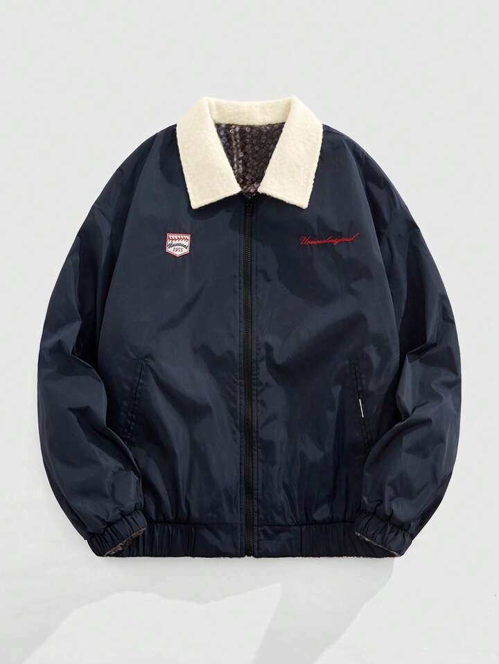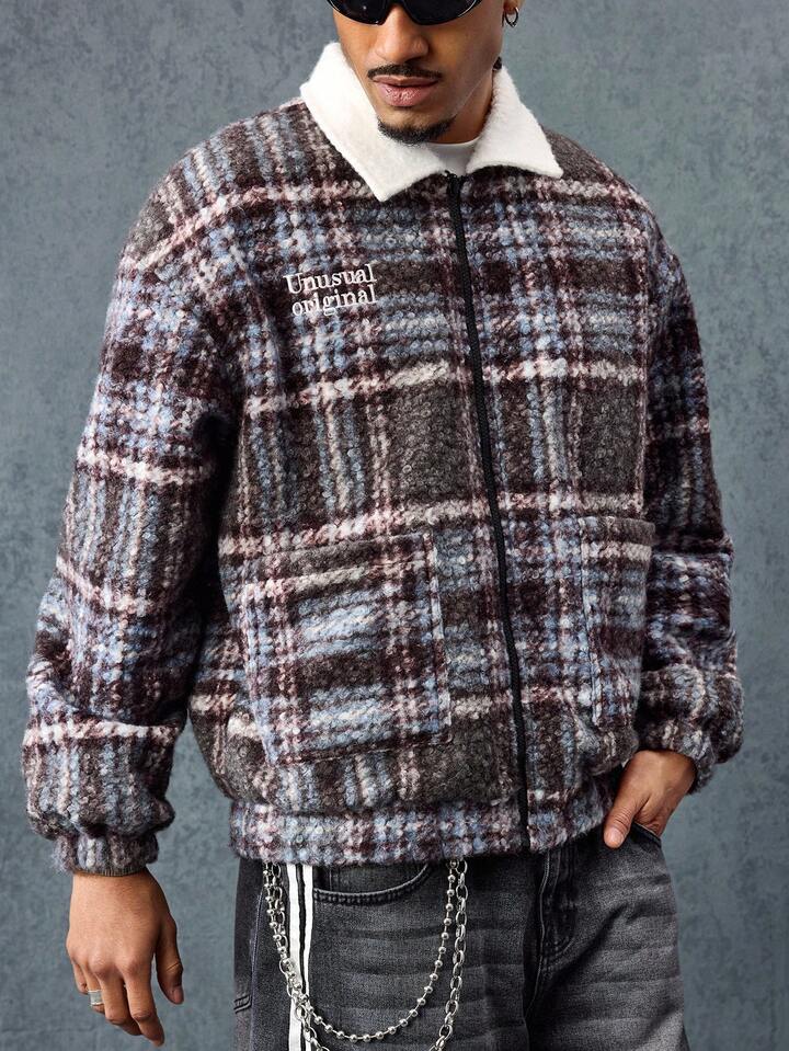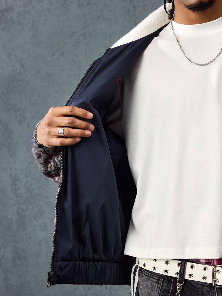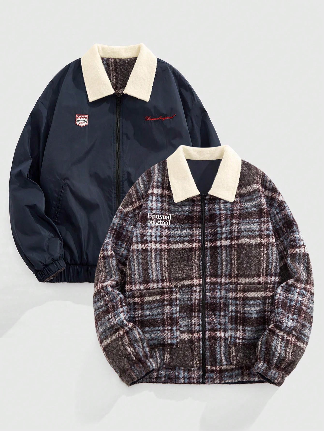 Street Life Men's Autumn/Winter Letter Plaid Printed Reversible Zip-Up Casual Jacket