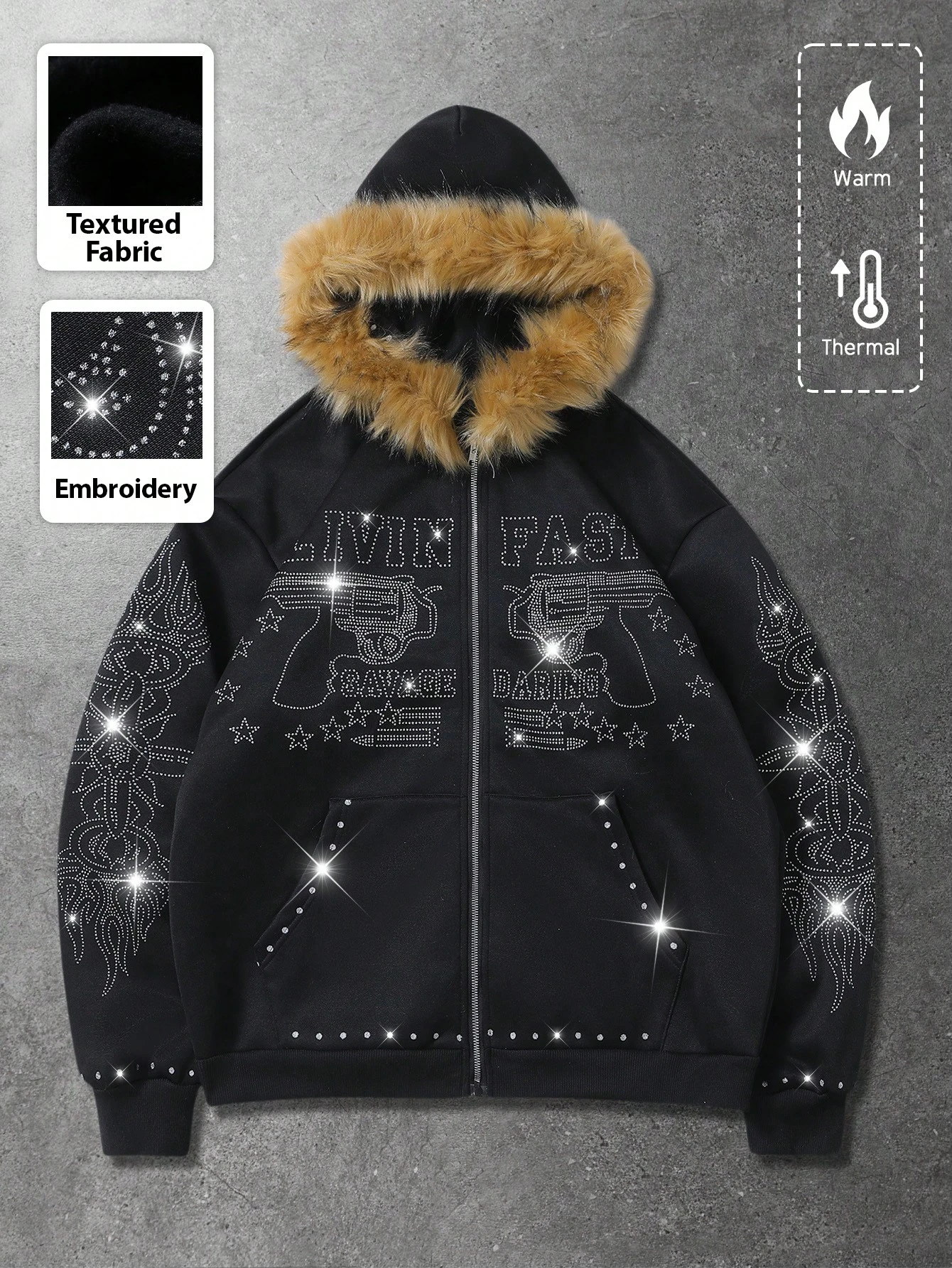 Street Life Men's Brand Fluffy Trim Glitter Print Sweatshirt, Long Sleeve Top