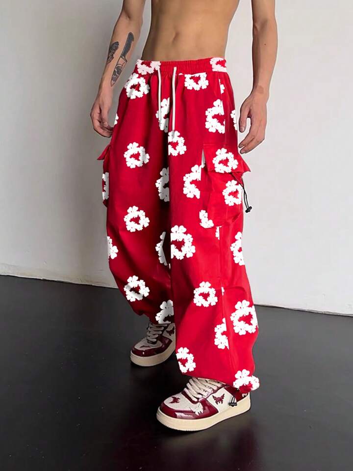 Street Life Men's Casual Flower Print Drawstring Waist Cargo Pants