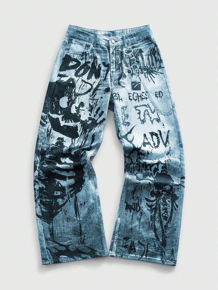 Street Life Men's Casual Hiphop Distressed Graffiti Print Slant Pocket Denim Jeans