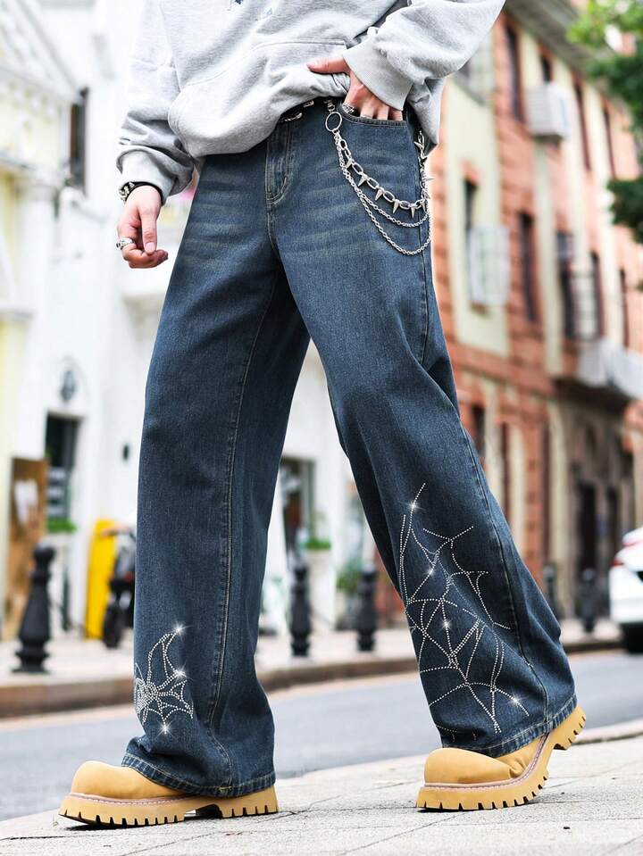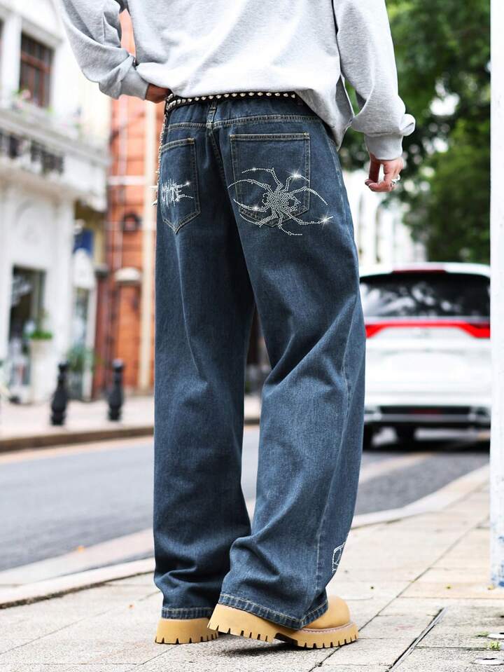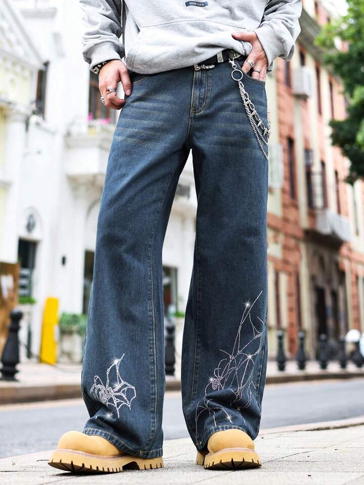 Street Life Men's Casual Jeans With Pockets And Rhinestone Spider Web Pattern