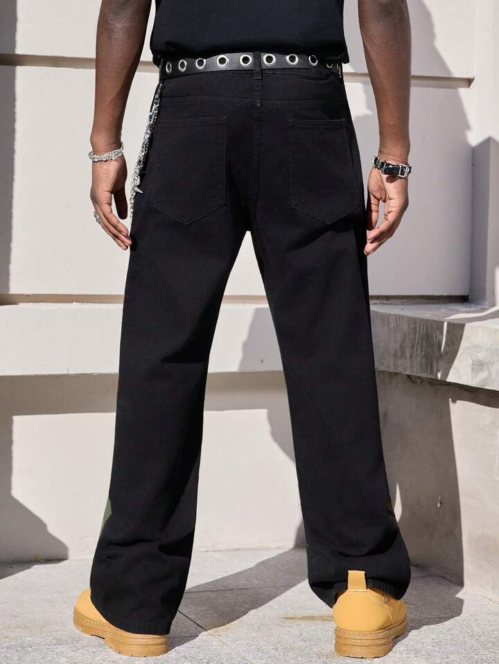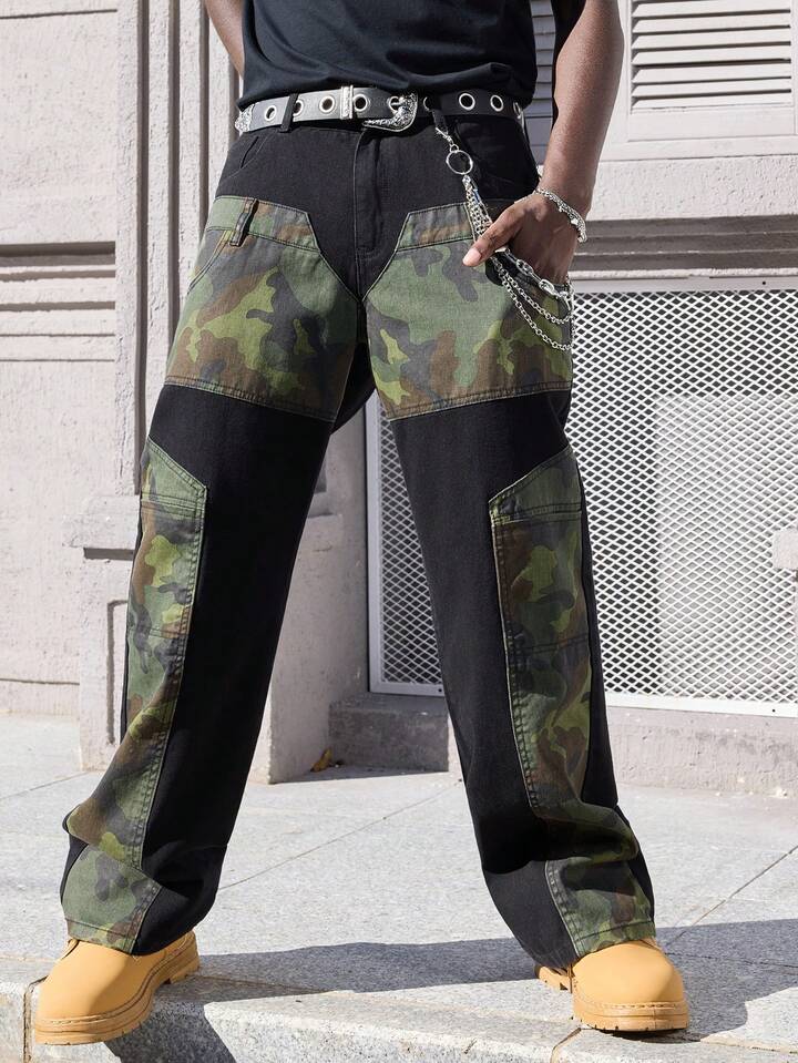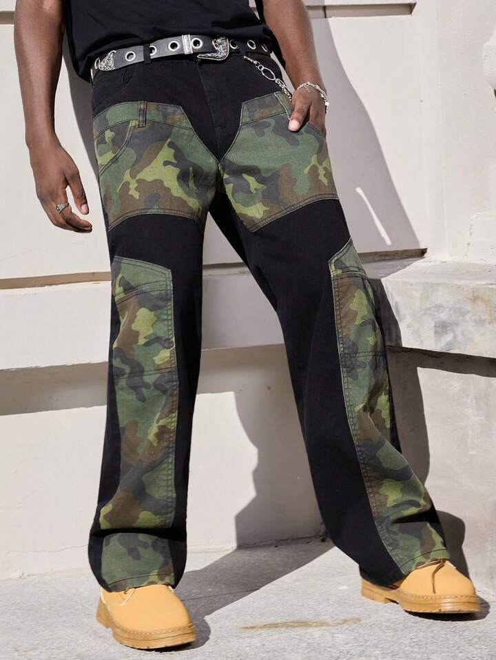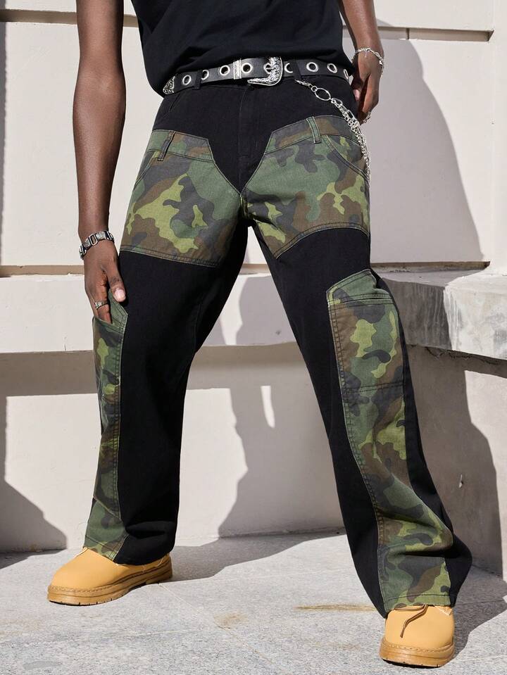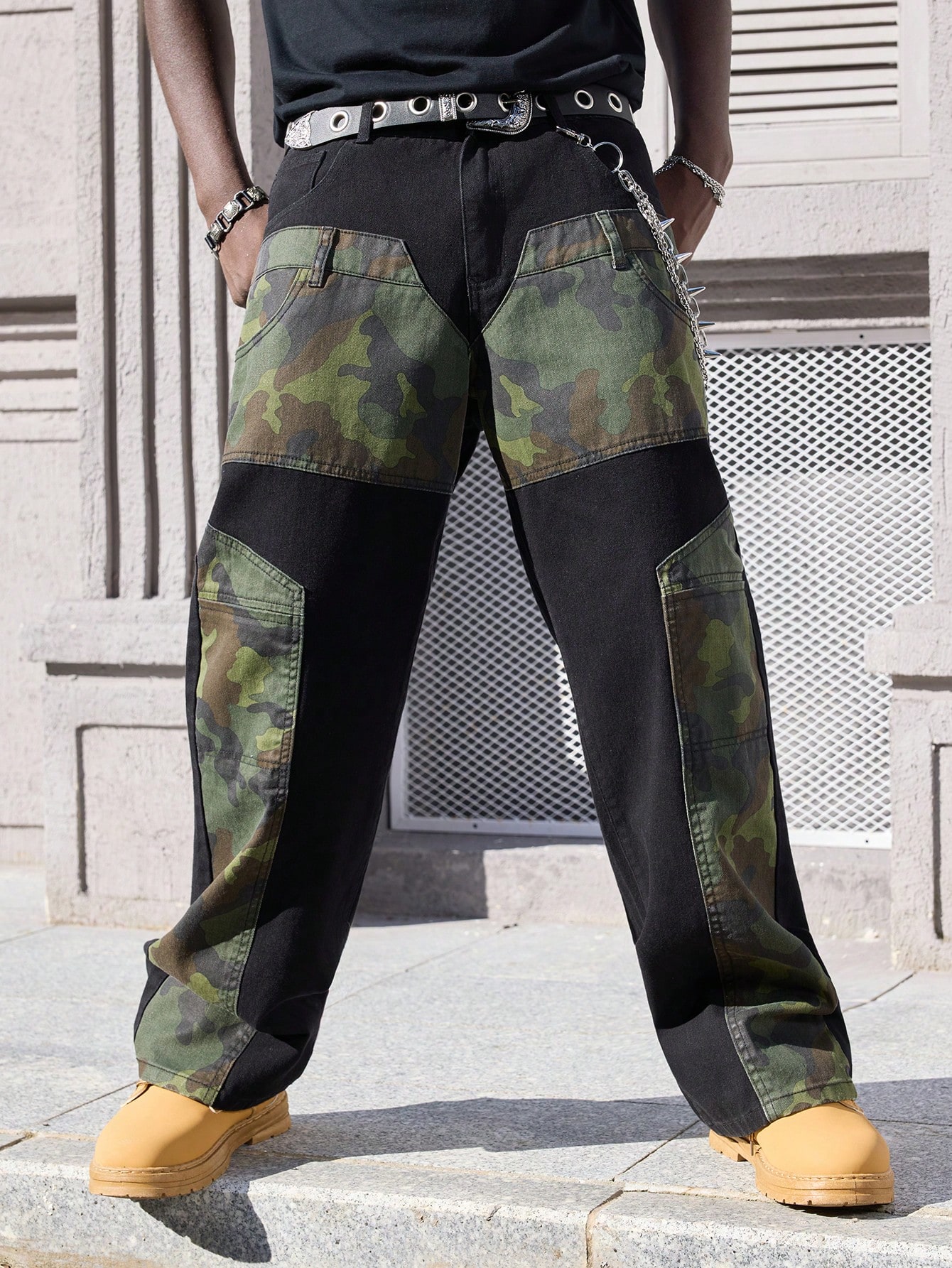 Street Life Men's Casual Patchwork Camouflage Slant Pocket Denim Jeans, Autumn, Grunge