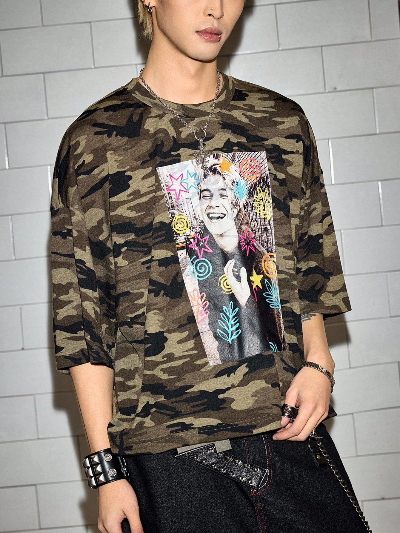 Street Life Men's Casual Portrait Camo Print Loose Fit Round Neck T-Shirt, Summer