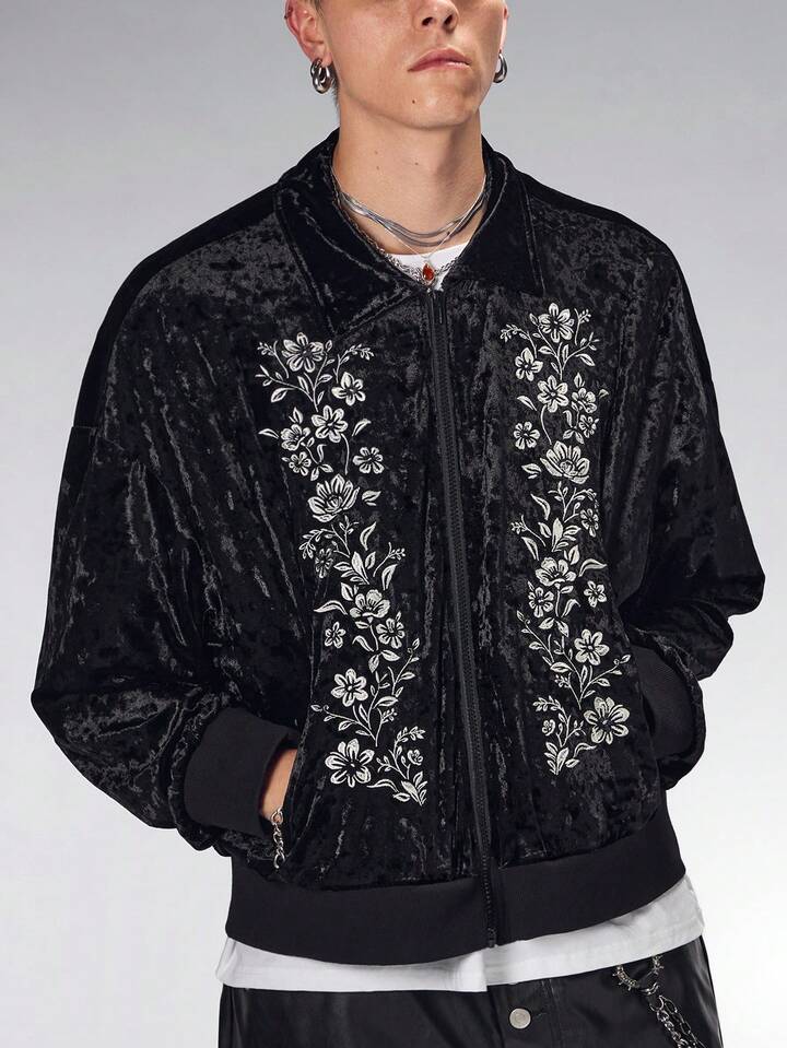 Street Life Men's Casual Vintage Velvet Floral Embroidered Long Sleeve Jacket, Autumn