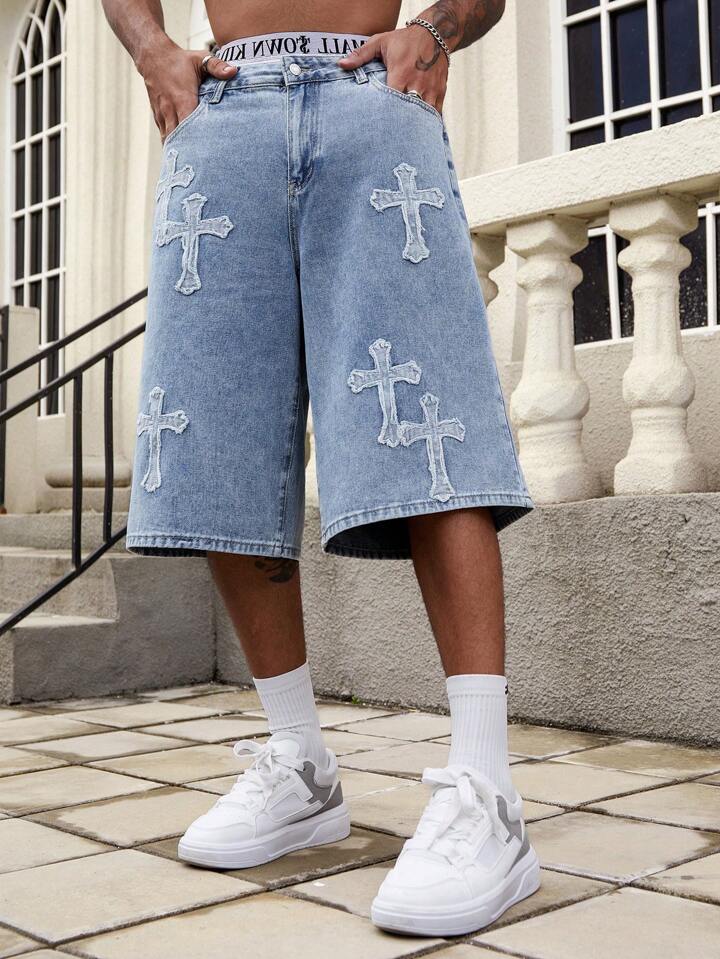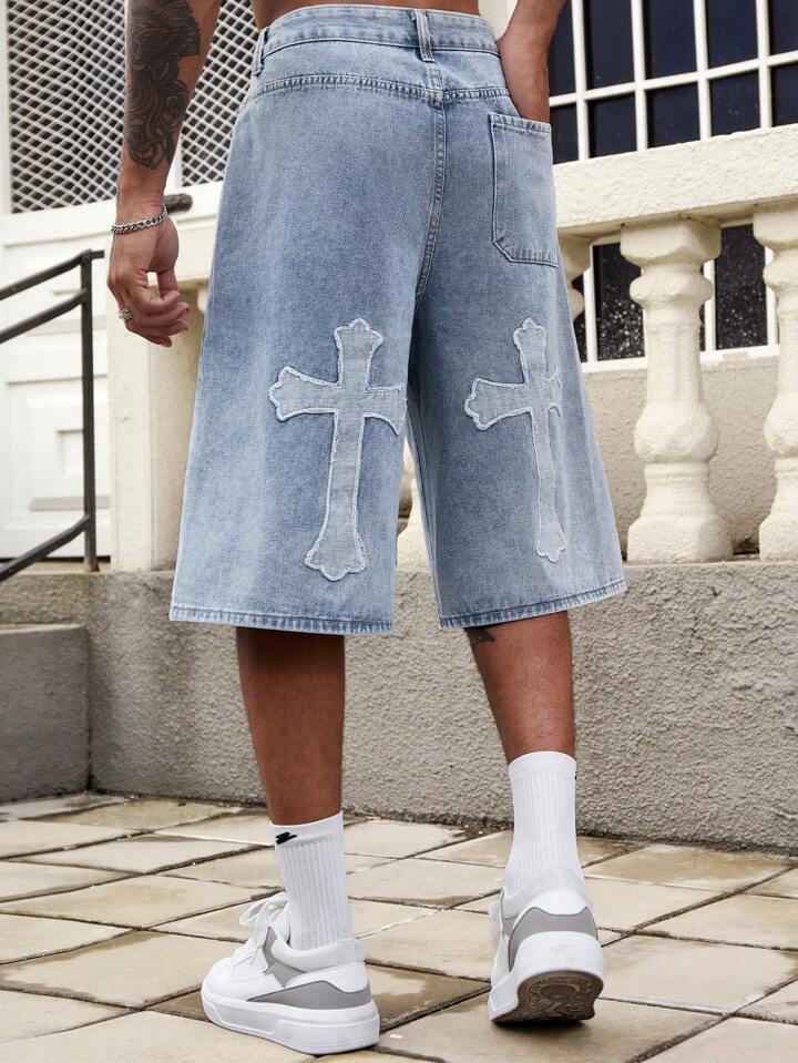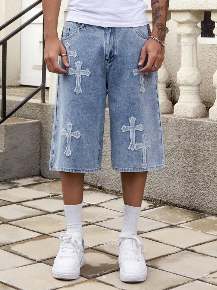 Street Life Men's Cross Embroidery Patch Loose Denim Shorts