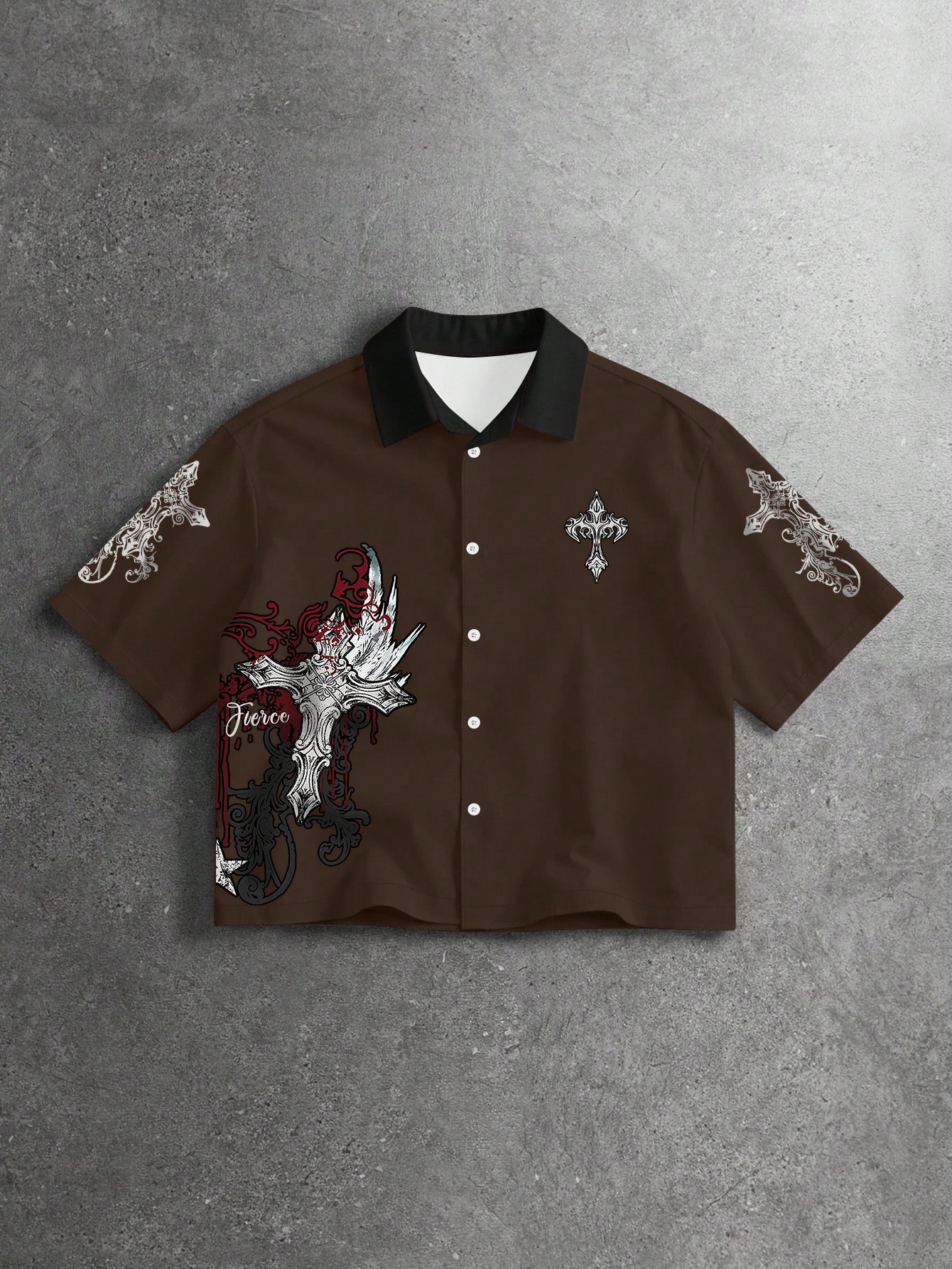 Street Life Men's Cross Print Short Sleeve Single-Breasted Casual Shirt