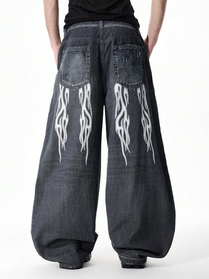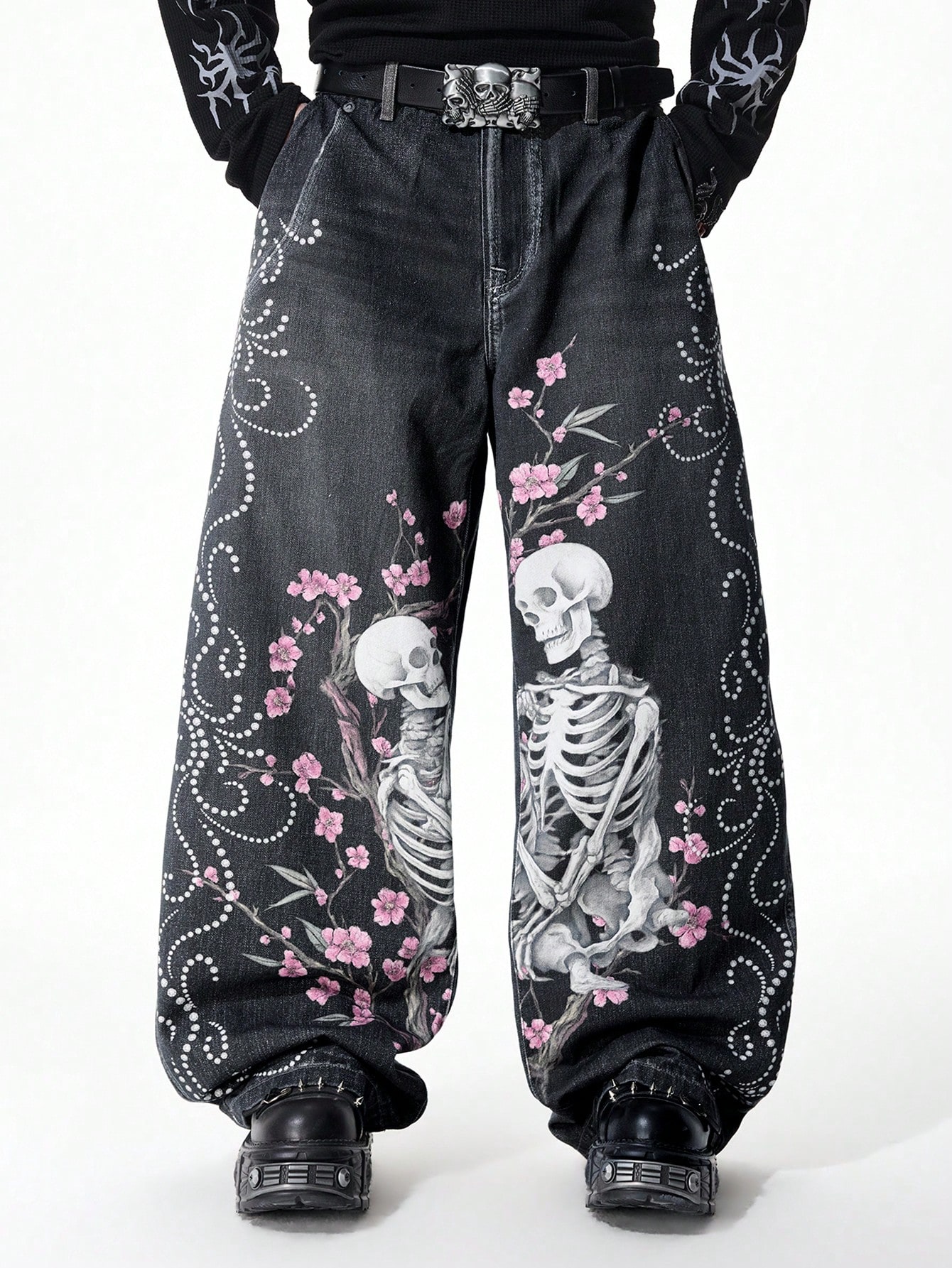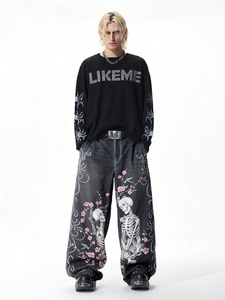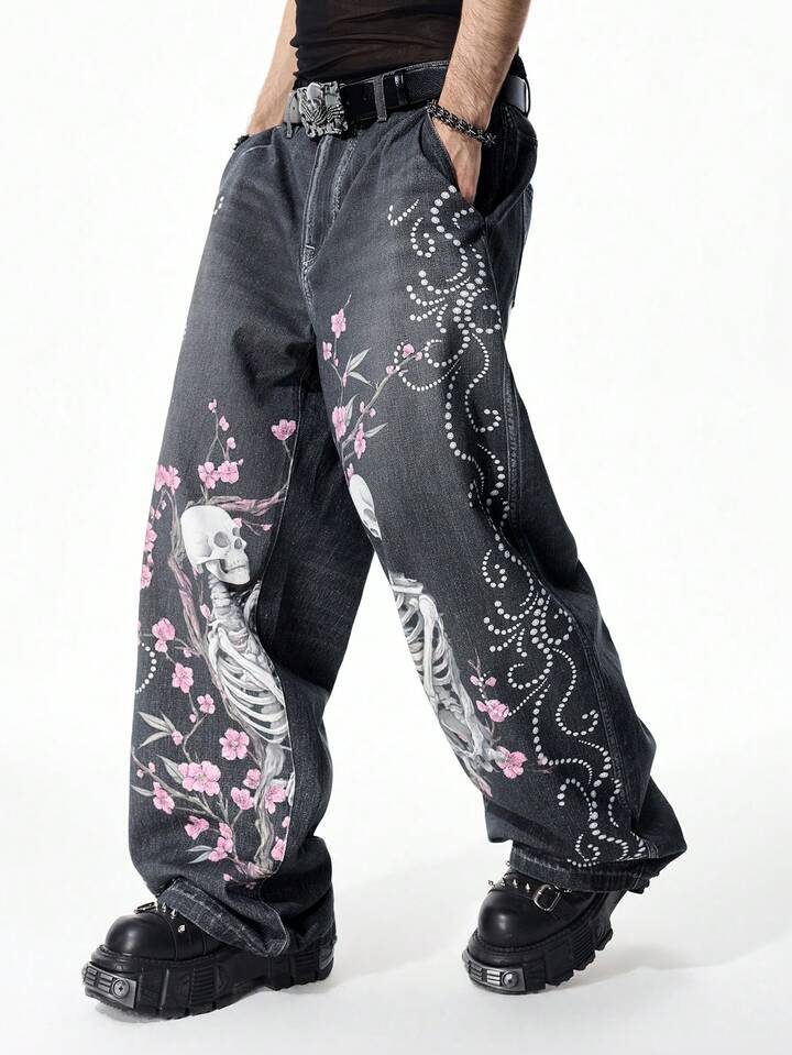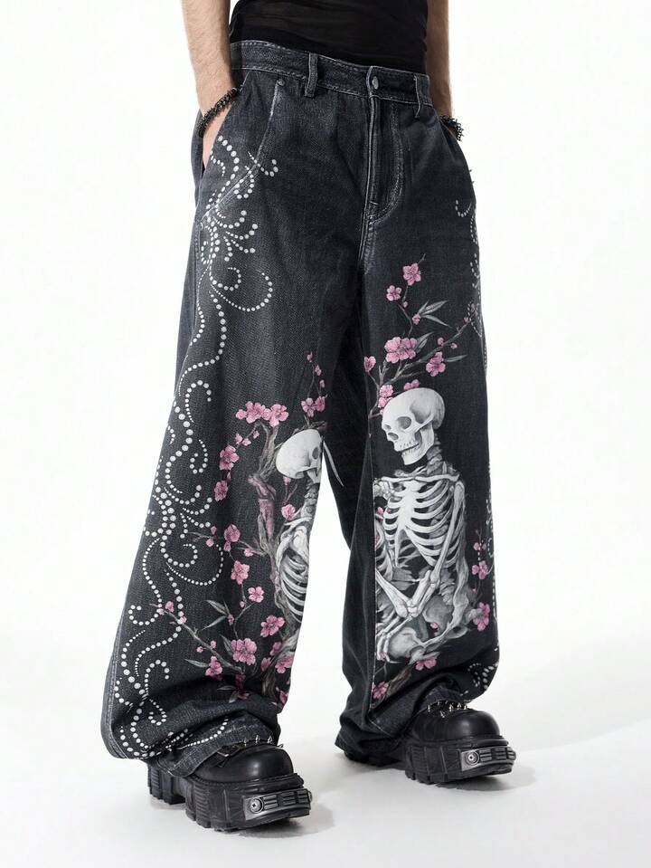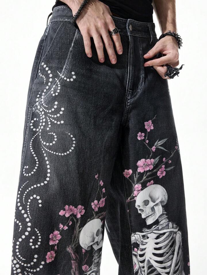 Street Life Men's Digital Print Skull & Sakura Flower Samurai Sword Graphic Jeans