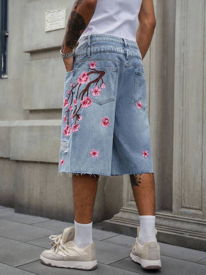 Street Life Men's Double-Layer Waistband Floral Embroidered Denim Shorts